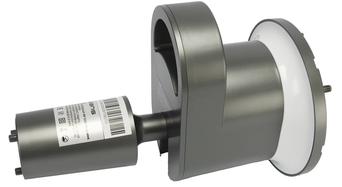 Моторный блок с механизмом регулировки наклона и вращения — это главная часть прибора. Внутри него располагается электронная начинка, а сбоку — дисплей и панель управления с пятью сенсорными кнопками (ее мы подробнее рассмотрим чуть ниже). Вокруг оси мотора навинчена шайба, крепящая заднюю часть защитной решетки.