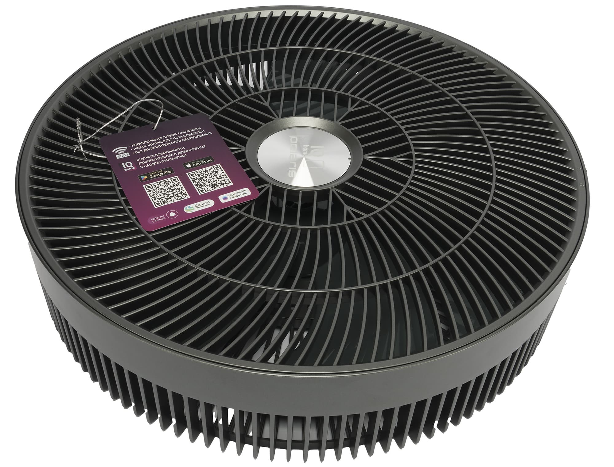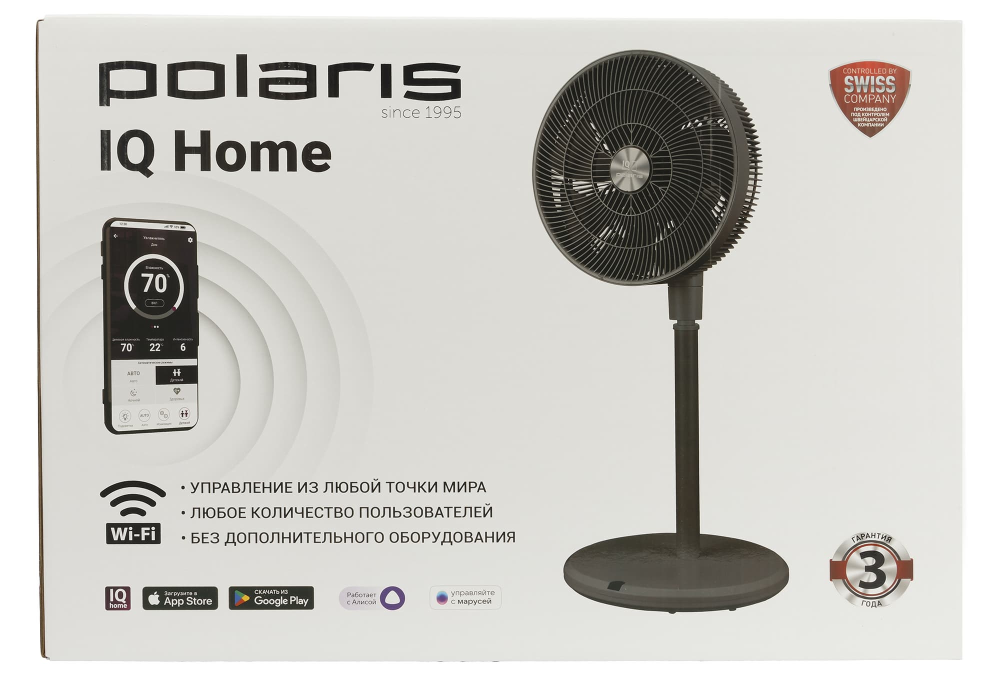 Вентилятор поставляется в довольно большой плоской коробке из белого глянцевого картона с цветной печатью. На лицевой стороне упаковки размещены логотипы производителя, наименование модели, пиктограммы с основными преимуществами устройства, фотография прибора и смартфона с приложением Polaris IQ Home, через которое реализуется управление вентилятором.