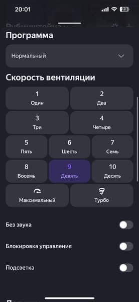 Здесь же мы можем отрегулировать скорость, но только до 10, хотя их у нашего вентилятора 12 при подключении через шнур электропитания и 9 при работе от аккумулятора. «Максимальный» и «Турбо» также оказываются 10 режимом.