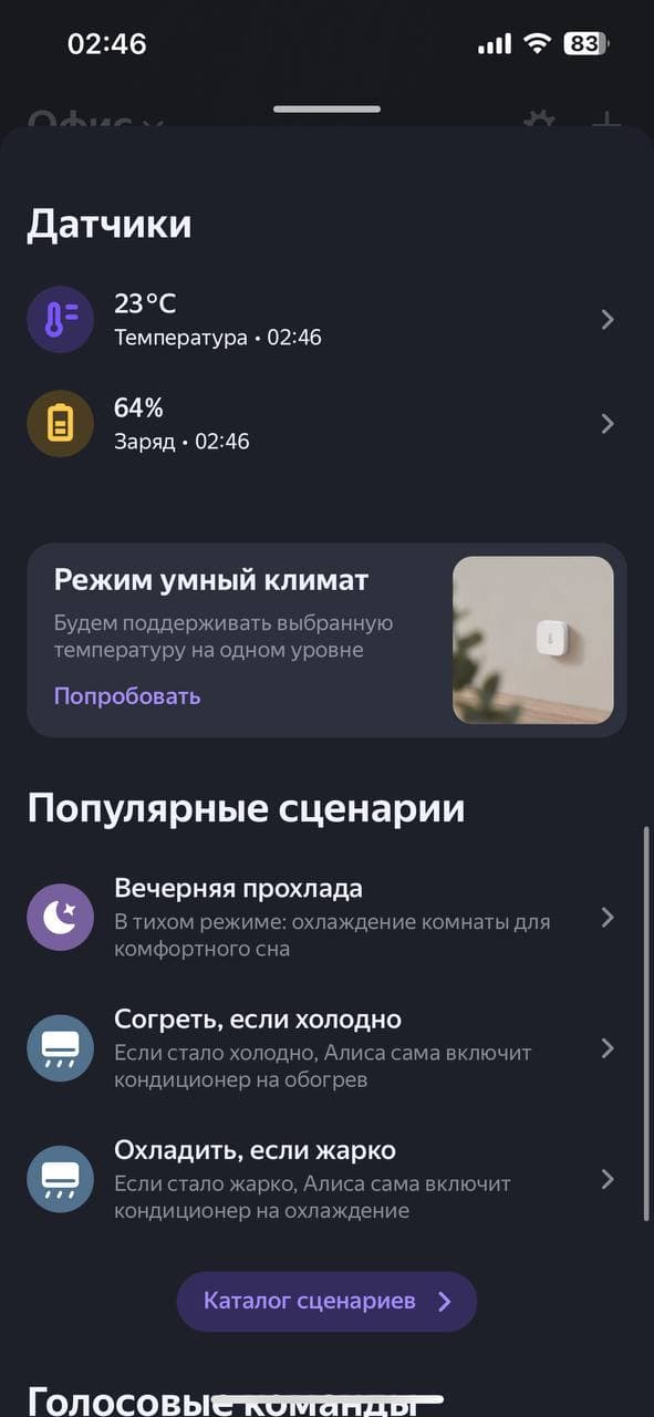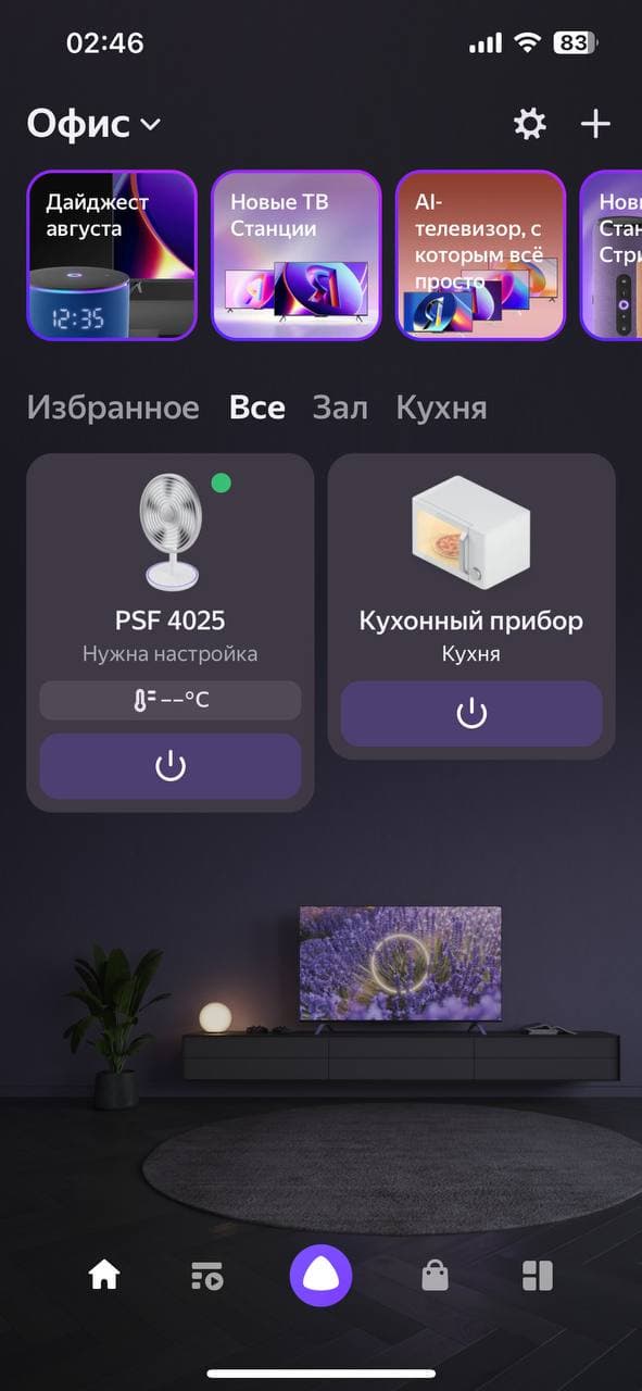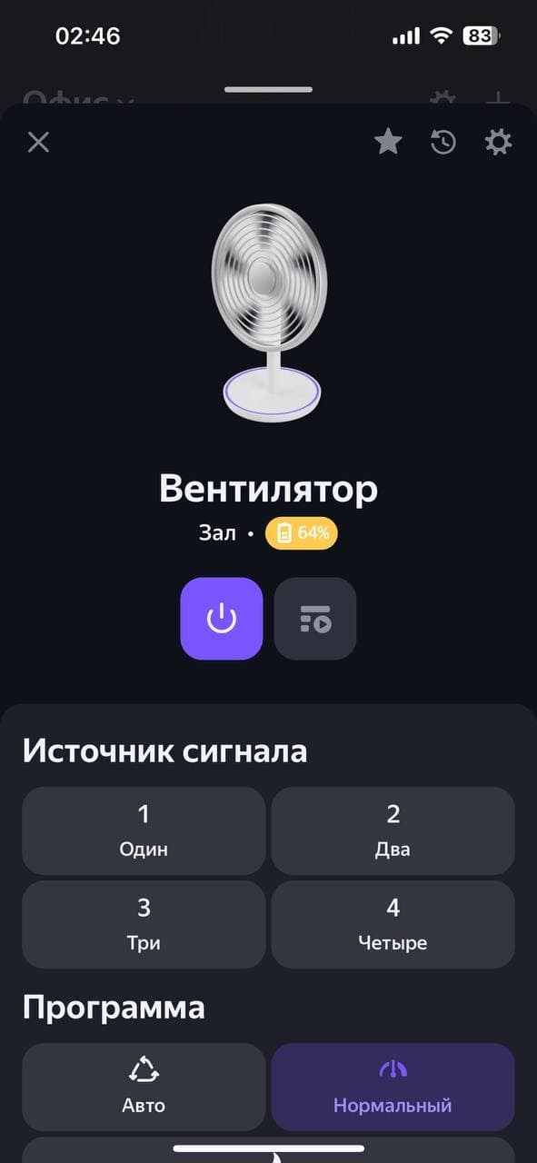 Нажав на кнопку с изображением прибора, попадаем на главный экран. Он же — «пульт управления» вентилятором. Тут можно сделать все те же действия, что позволяет нам панель управления на приборе и пульт ДУ. Мы их проверили, они срабатывают, поэтому останавливаться здесь не видим причин. Алиса интересует нас в первую очередь как голосовой помощник и мы хотим проверить ее в этом качестве.