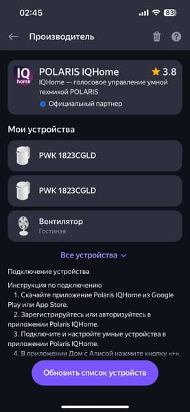 Процесс добавления вентилятора стандартен — через главное окно «Умного дома» выбираем пункт «Добавить устройство», после чего выбираем из списка различных производителей Polaris IQ Home. Далее вводим данные от нашего аккаунта Polaris и получаем доступ к управлению вентилятором.