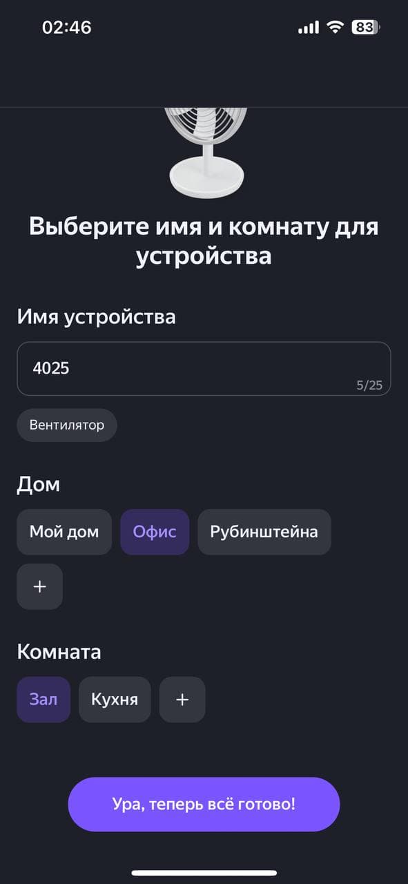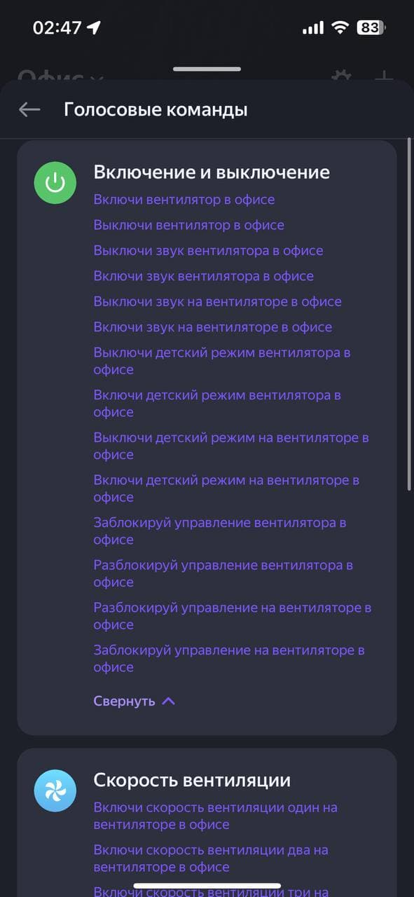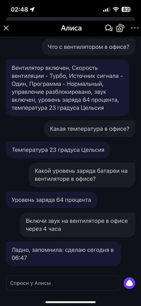 Алиса тоже неплохо руководит вентилятором как из приложения, так и через умную колонку. Она знает достаточно много команд — от статуса прибора, включения/выключения и установки таймера, ночника, переключения режимов, скоростей и до блокировки управления и отключения звуковых сигналов.