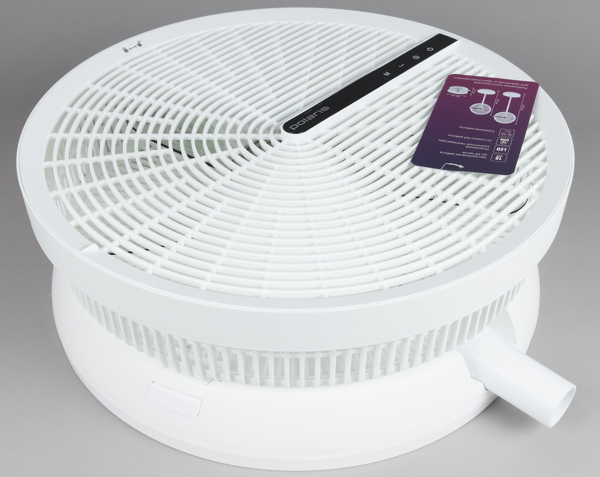 Защелки скрываются внутри нижней части под двумя длинными белыми кнопками «Push». Одновременное нажатие этих кнопок позволяет без труда отсоединить крыльчатку с решеткой и моторным блоком от основания.