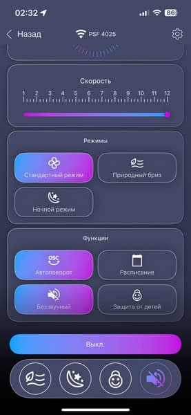 Все заявленные 12 скоростей исправно работают, три сценария работы также показали себя удобными в повседневном использовании — «Ночной режим» постепенно понижает скорость до минимального уровня, а «Естественный обдув» имитирует ветер, циклично замедляясь и ускоряясь.