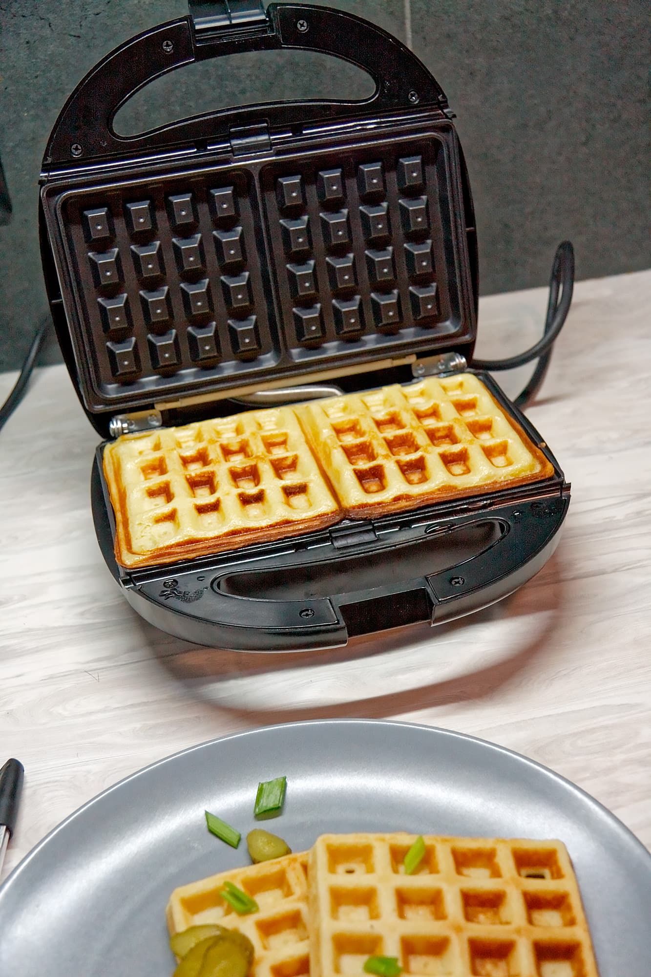 Добавили к вафлям немного зеленого лука и маринованных огурчиков.