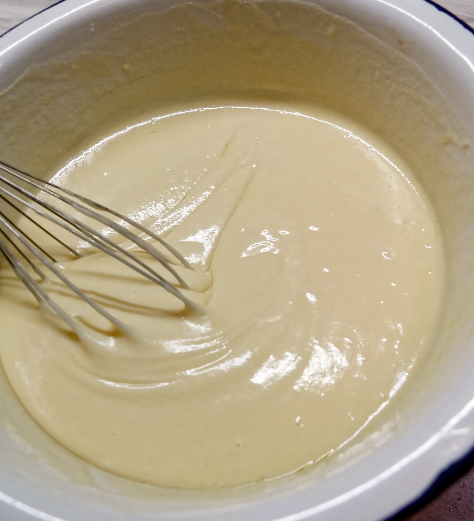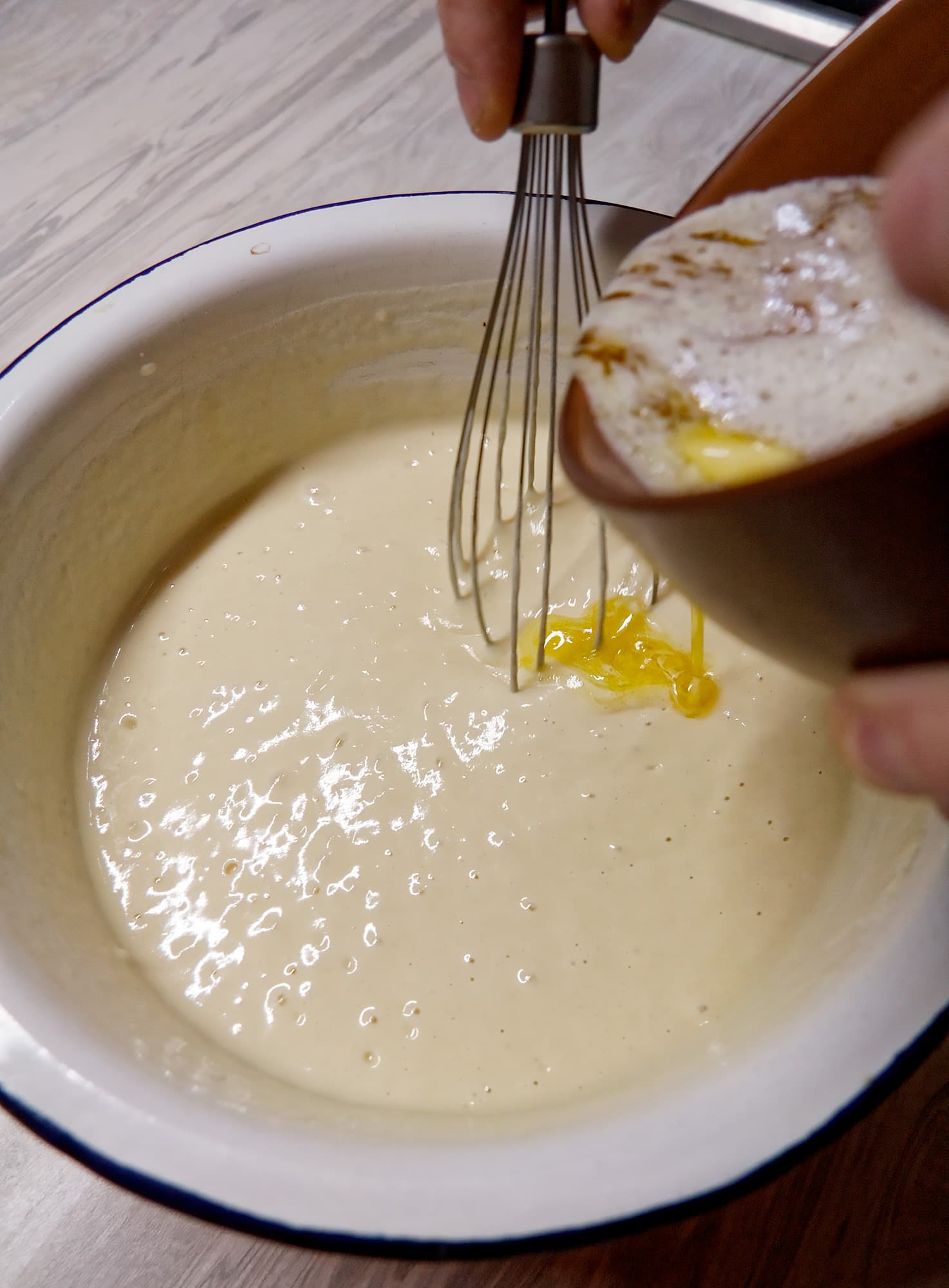Все, что от нас потребовалось — залить смесь теплой водой, добавить растопленное сливочное масло и перемешать его до однородной консистенции.