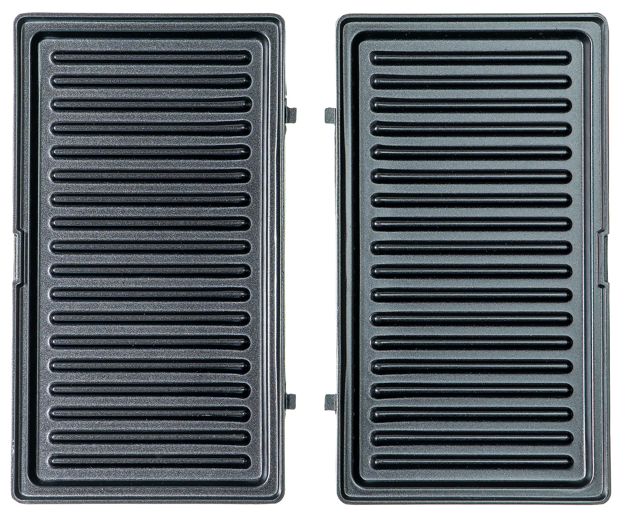На панели для гриля нанесены специальные бороздки, предназначенные для более интенсивного контакта горячих панелей с продуктом и сбора вытапливаемого жира.