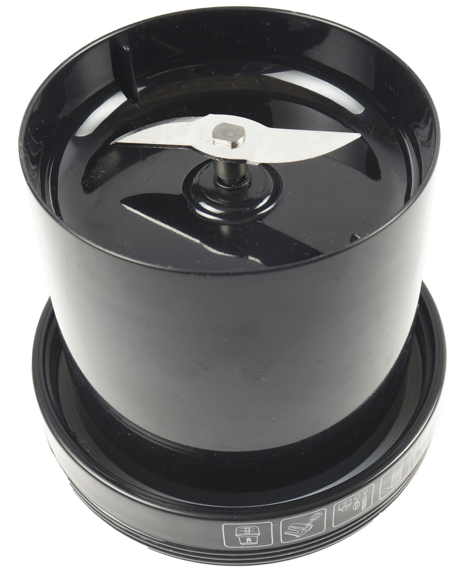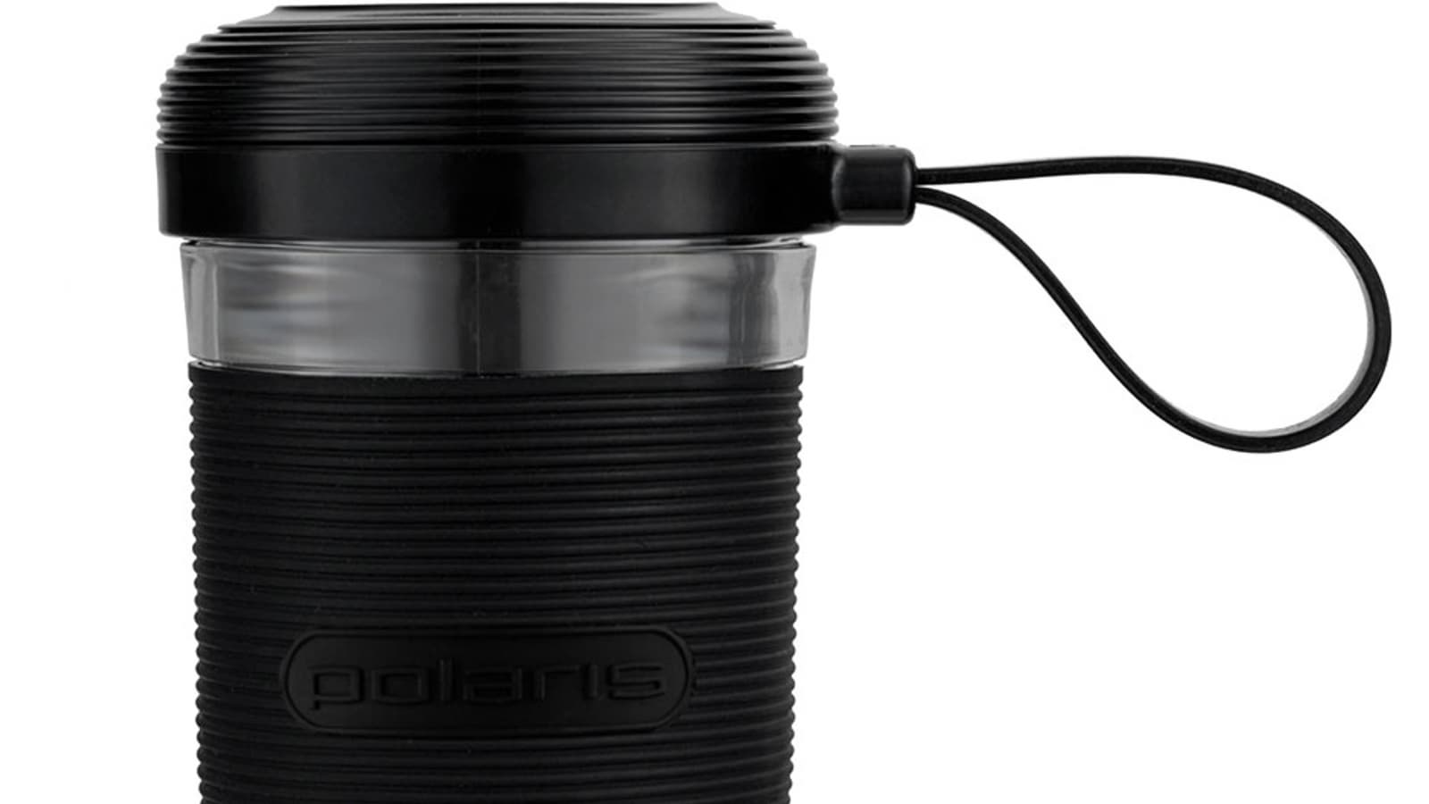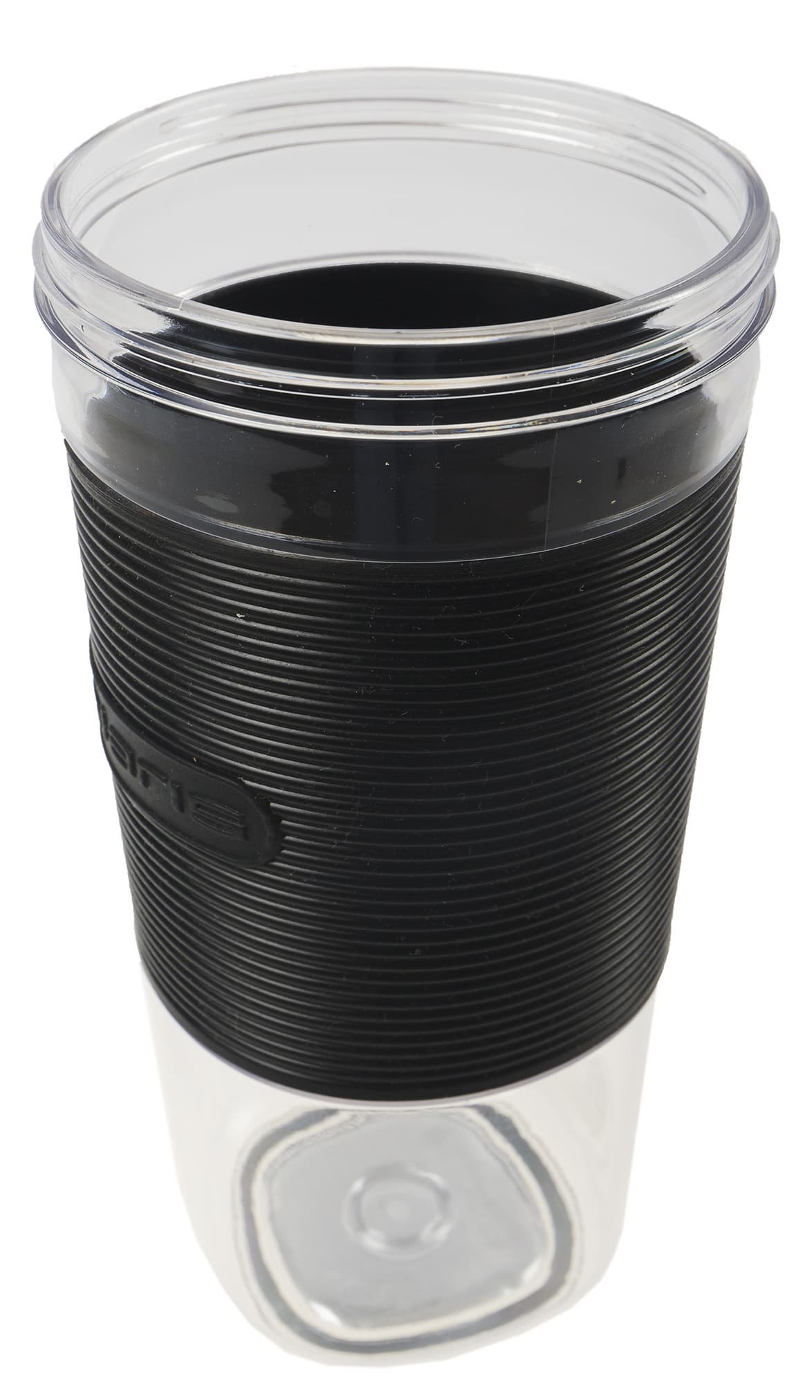 Сверху на стакане расположена резьба для закручивания крышки — моторного блока. Посередине мы видим резиновый ребристый противоскользящий ободок, который надежно сидит на стакане благодаря выемкам сверху и снизу. На резиновой детали указано наименование бренда.