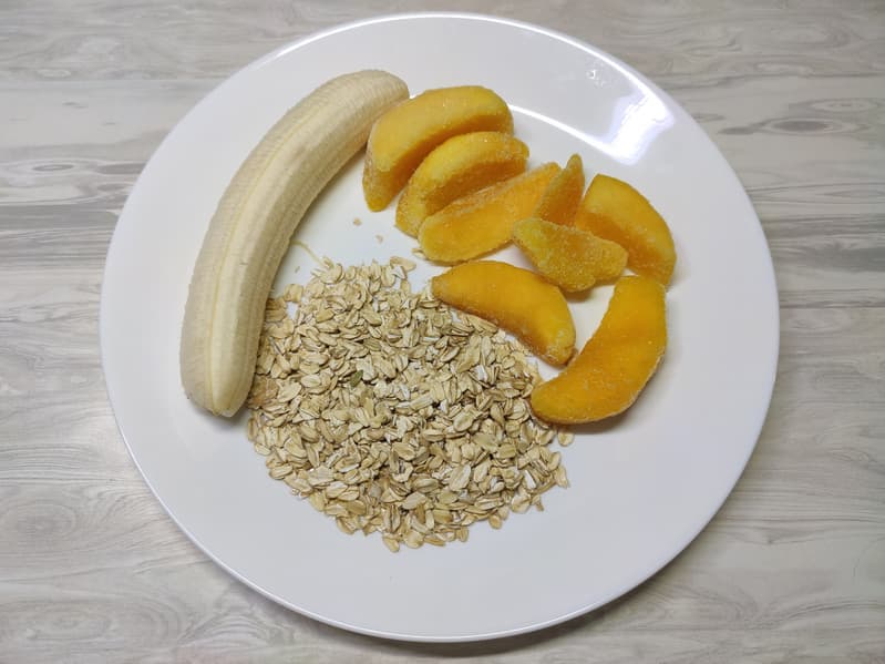 - Смузи из банана, замороженного манго, овсяных хлопьев и молока