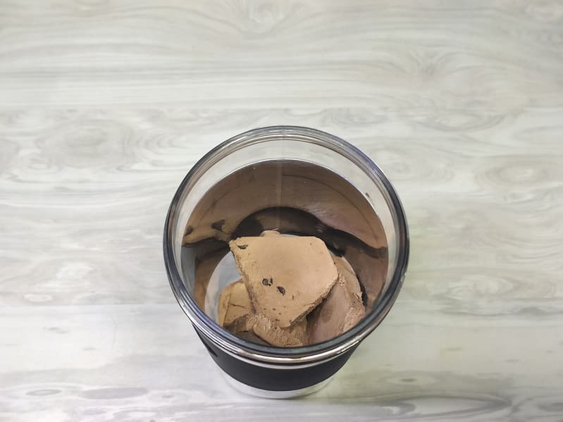 Шоколадный брикет мы разрезали на две части, чтобы приготовить две порции коктейля. При приготовлении каждой порции нарезали каждую половину еще на несколько крупных кусков.