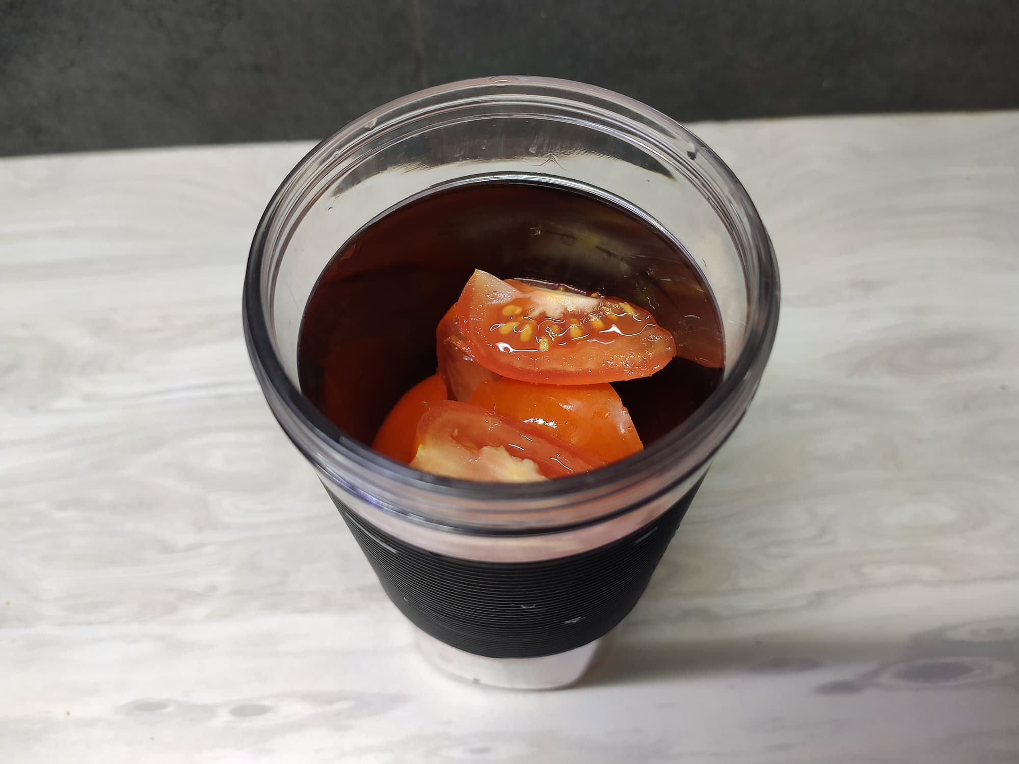 Разрезали томаты на четвертинки. До отметки максимум в чашу влезло только 220 г томатов.