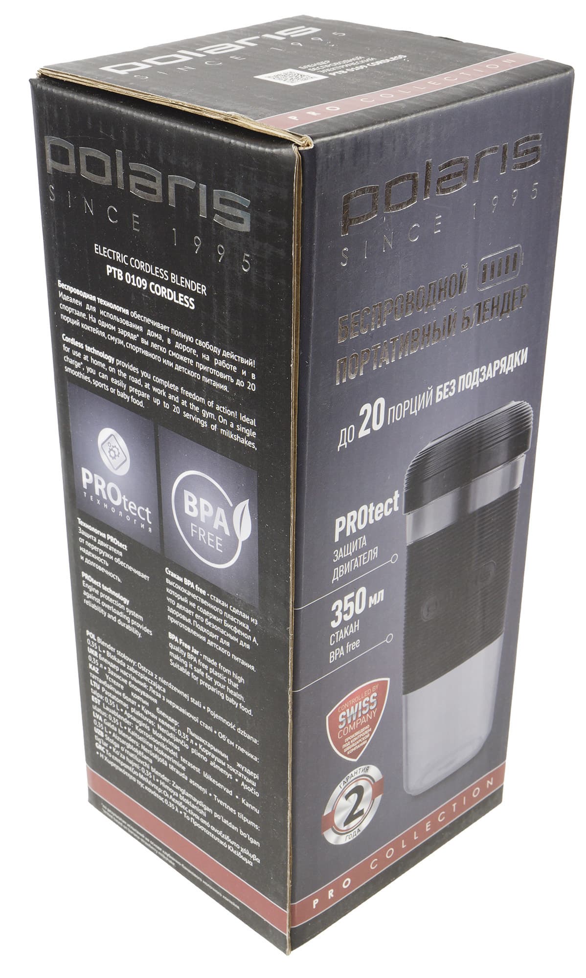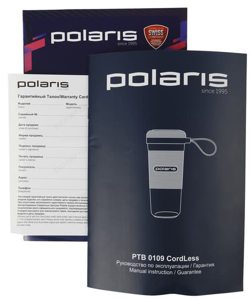 Сама коробка оформлена в фирменном стиле Polaris с применением полноцветной печати: на лицевой стороне мы видим красочную фотографию блендера. На боковых гранях — дополнительная техническая информация и подробное описание ключевых конструктивных элементов.
