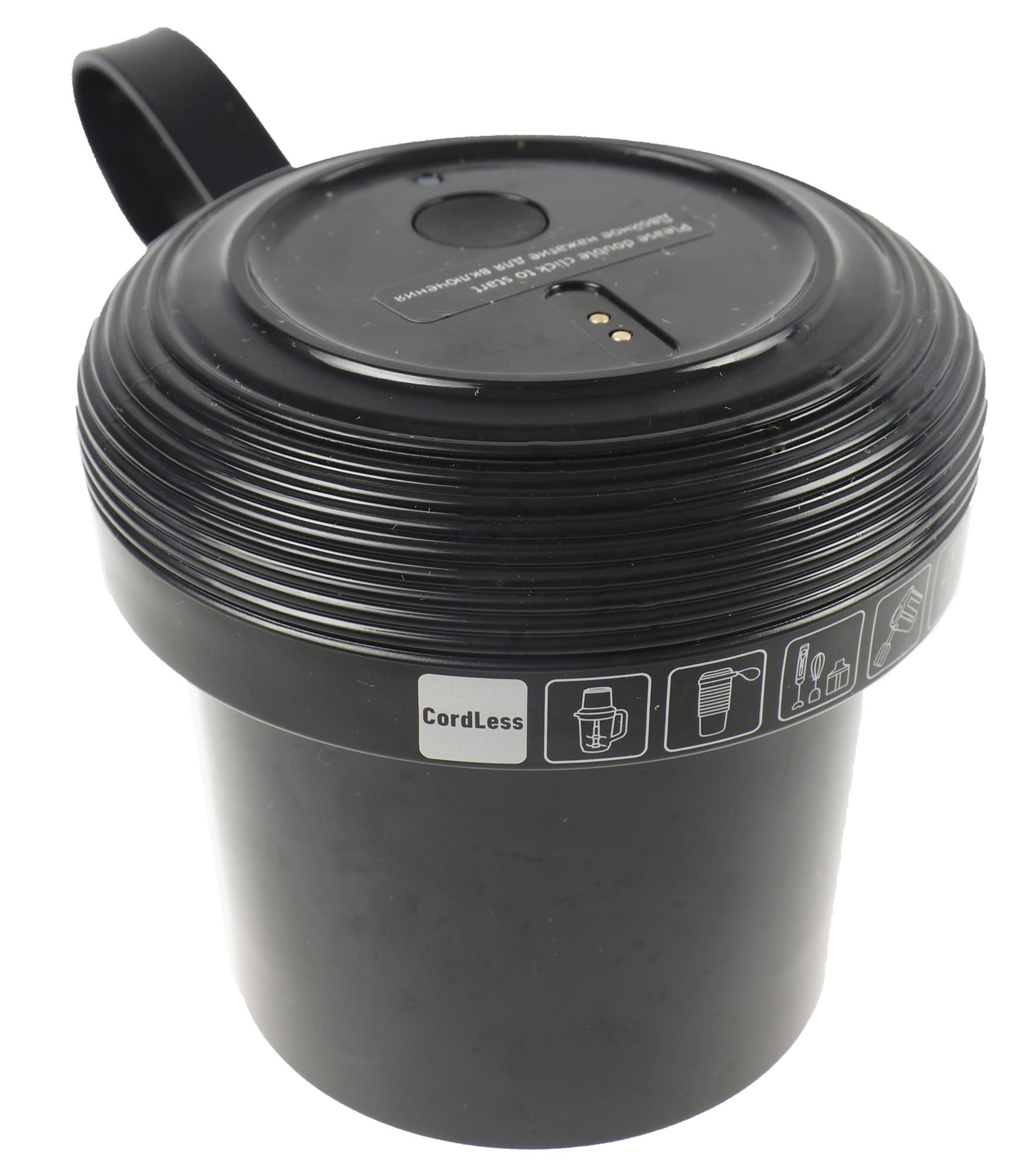 Перед первым использованием производитель рекомендует промыть и просушить стакан, а также полностью зарядить батарею (на это потребуется около 1,5 часов). Моторный блок и ножи можно протереть влажной, а затем сухой тканью.