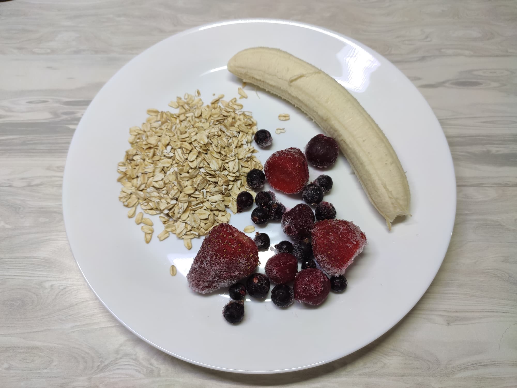 Для него мы используем несколько ложек сухой овсянки, свежий банан, горсть замороженных ягод и молоко.