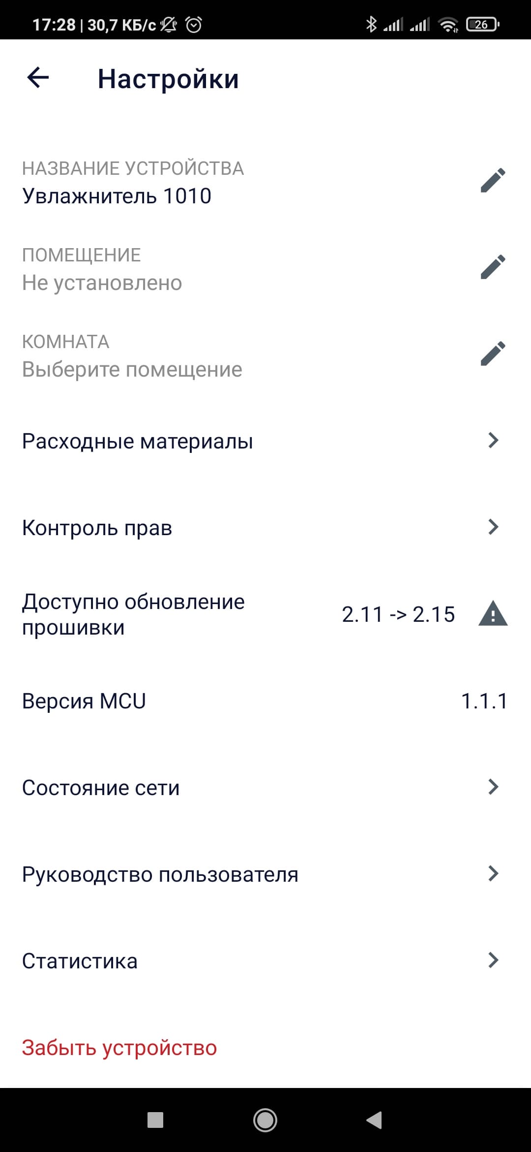 На главной странице в правом верхнем углу расположен значок настроек. Тапнув по нему, вы сможете дать имя устройству и задать для него помещение, а также расшарить права на управление увлажнителем, отследить состояние резервуара и фильтра, проверить, какая часть сети просела, если PUH 1010 не получает сигналы из приложения, и оценить динамику изменения влажности в помещении.
