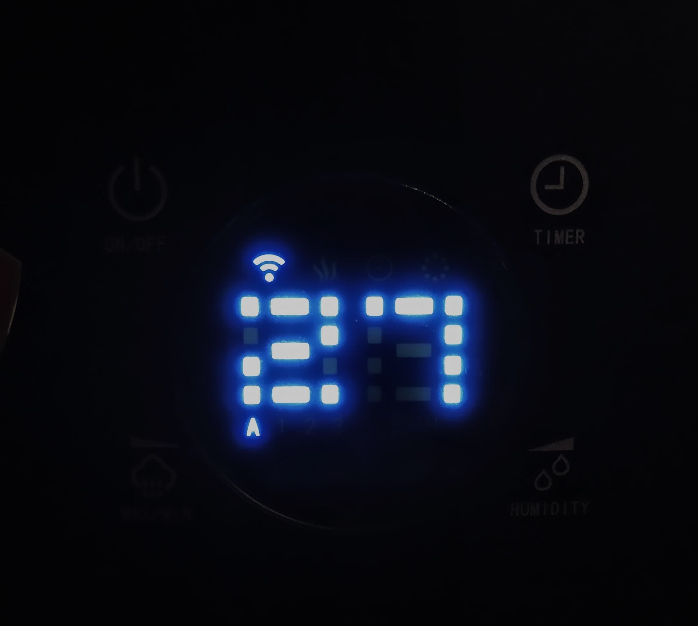 Оставшаяся кнопка Humidity позволяет вручную задать целевой уровень влажности воздуха от 25% до 75%. Шаг — 5%. При достижении значения Со (следующего за 75%) прибор выходит из режима установки влажности с 3-секундной задержкой. При установке желаемого уровня влажности прибор запомнит его значение в течение 5 секунд, после чего на дисплее вновь отобразится текущая влажность. Чтобы узнать текущую целевую влажность, надо нажать на сенсор один раз — она ненадолго отобразится на дисплее. Если установленное значение влажности меньше текущего, прибор уйдет в спящий режим.