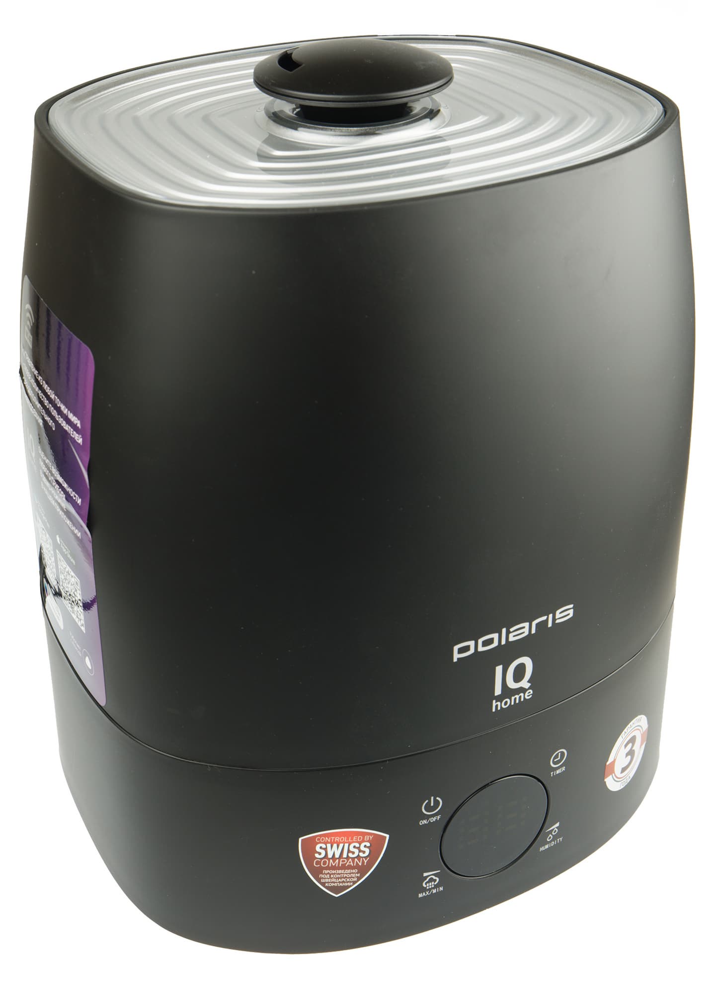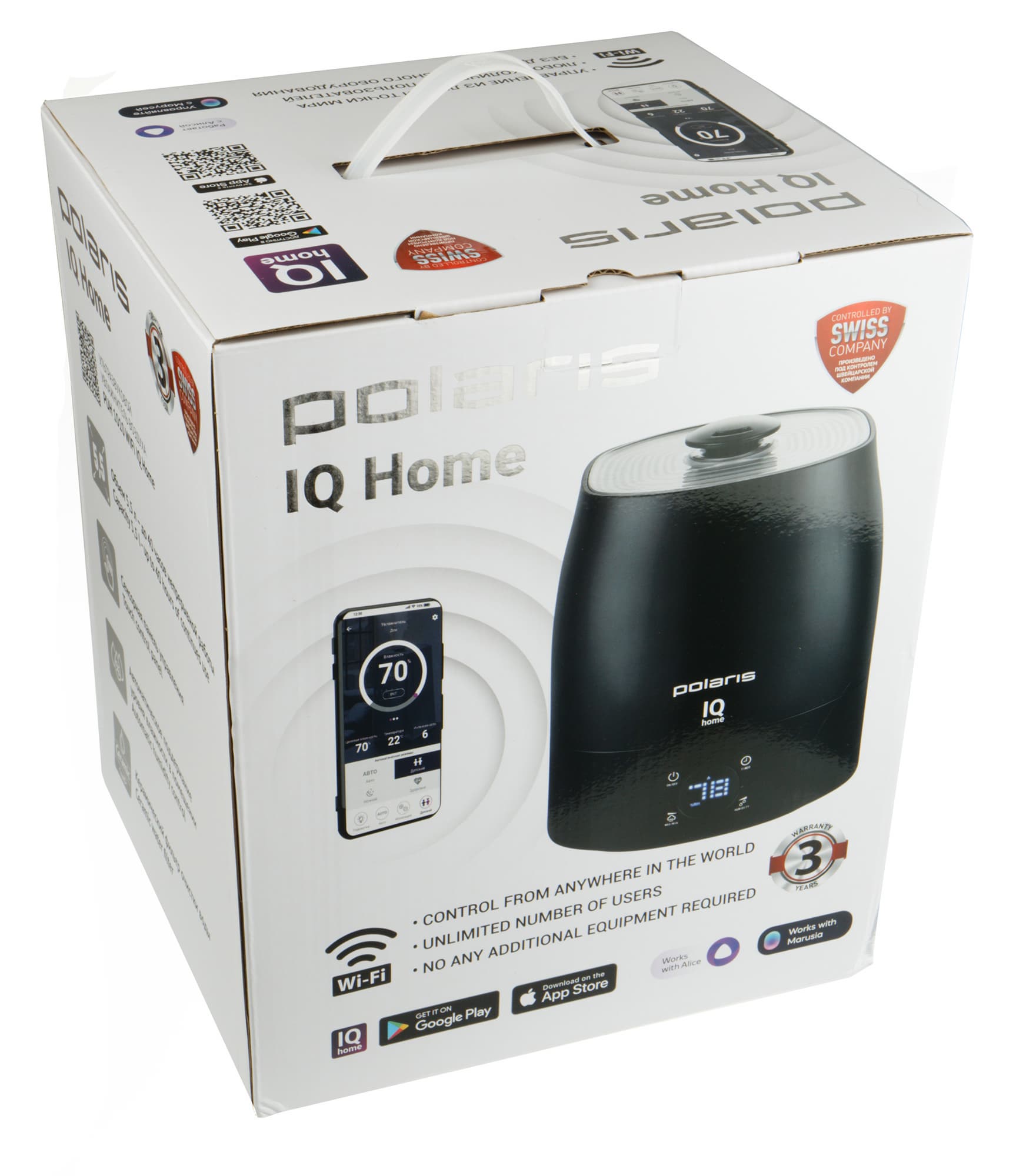 «Умные» товары Polaris легко узнать стильной по коробке из белого матового картона. На ее гранях можно увидеть изображение прибора и ознакомиться с его особенностями, а так же на двух языках (русском и английском) прочитать про приложение IQ Home, с помощью которого без дополнительного оборудования осуществляется дистанционное управление увлажнителем. На крышке коробки — два QR-кода для установки приложения на Android или iOS.