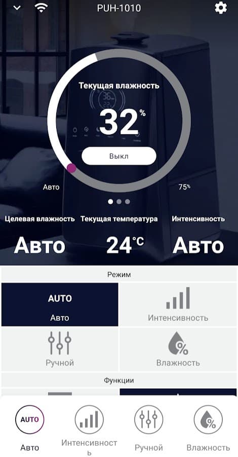 Наконец-то мы можем увидеть температуру в помещении (на дисплее увлажнителя она не демонстрируется). Помимо нее, на главной странице мы видим текущий уровень влажности и актуальный режим. По умолчанию это Авто: и целевую влажность, и интенсивность подачи пара прибор выбирает сам. Кнопка в центре круга включает и выключает увлажнитель.