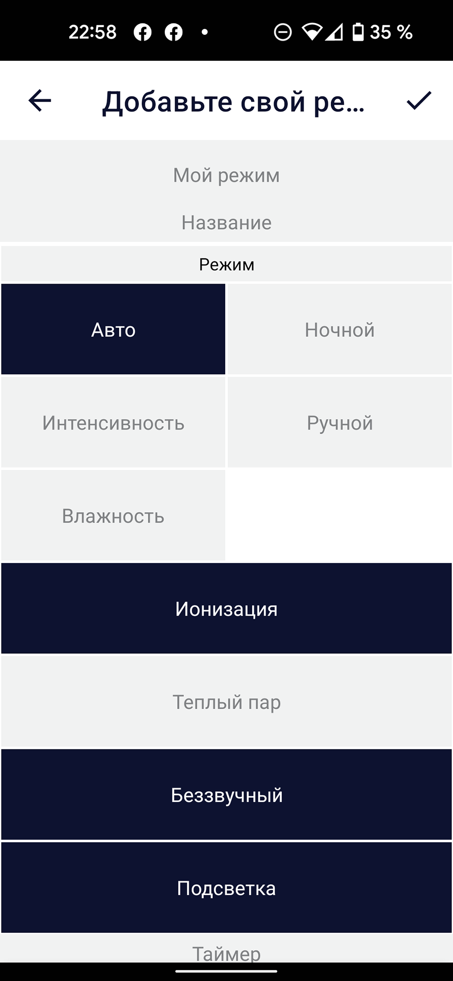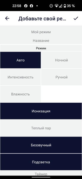 Возможность редактирования режимов позволяет делать управление устройством еще более гибким. К примеру, если не понравится наличие ионизации в предустановленном «детском» режиме, вполне можно создать собственный: тихий, с теплым паром, погашенной подсветкой и отключенным ионизатором.