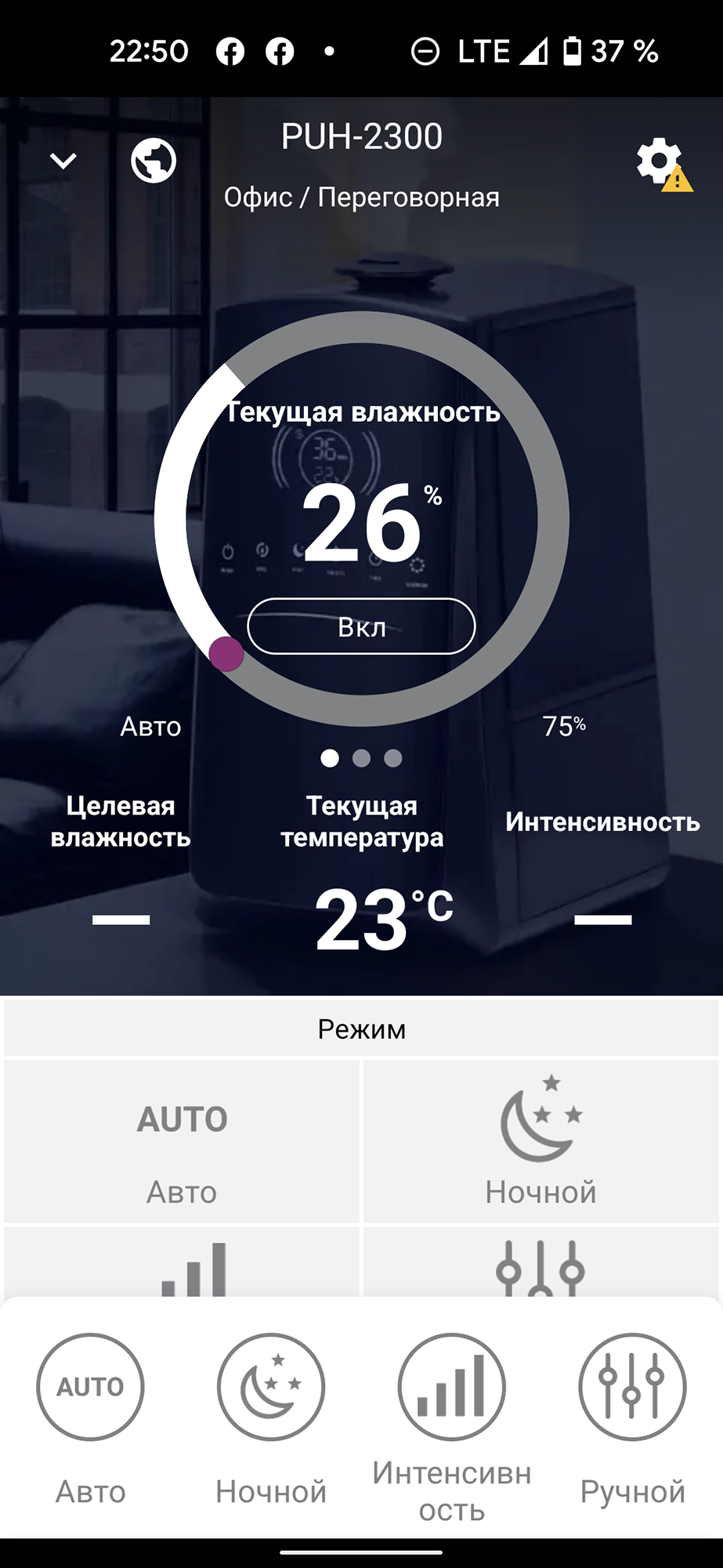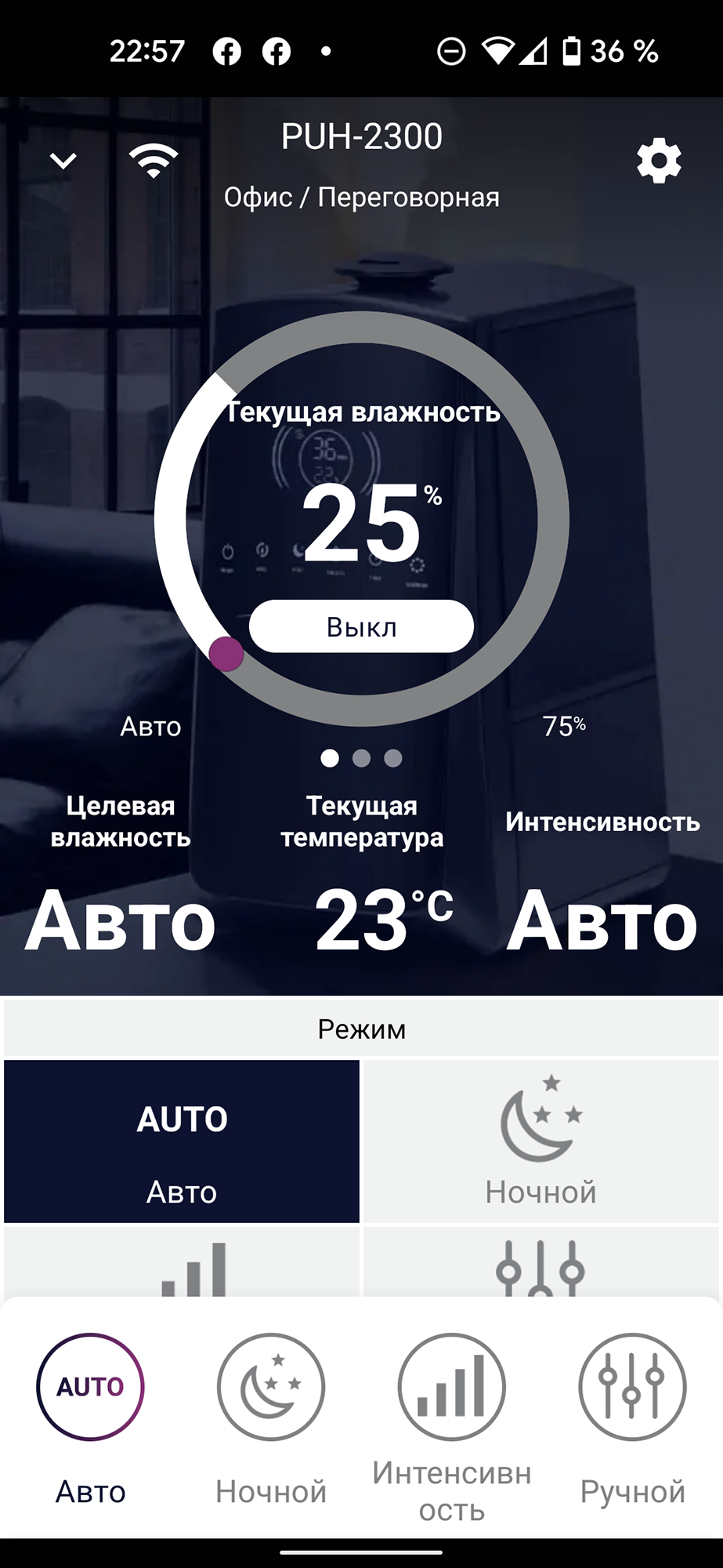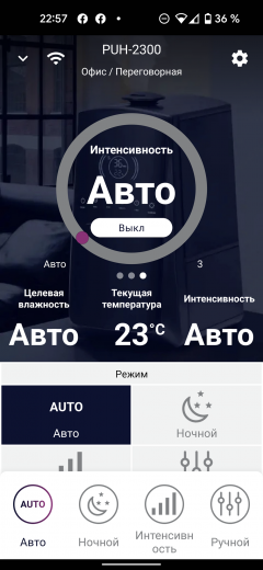 Чуть ниже можно выбрать подходящий режим работы (автоматический, ночной, детский, ручной) или настроить свой собственный, выбрав интенсивность увлажнения, целевую влажность, громкость звуковой сигнализации и дополнительные функции: ионизацию, теплый пар, беззвучность, подсветку дисплея и бака, а также время автоотключения прибора.