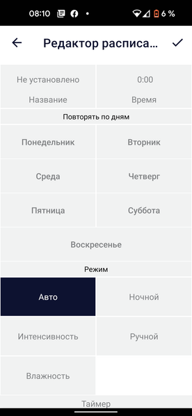 Но самая полезная, на наш взгляд, функция приложения — возможность настройки работы по расписанию. В этом разделе мы можем запрограммировать увлажнитель включать и выключать выбранные режимы и функции в нужное время по дням недели. Прибор сможет включаться только тогда, когда увлажнение воздуха действительно требуется, и устанавливать подходящий режим работы в выбранное время суток. Пользователю остается только своевременно подливать воду в резервуар.