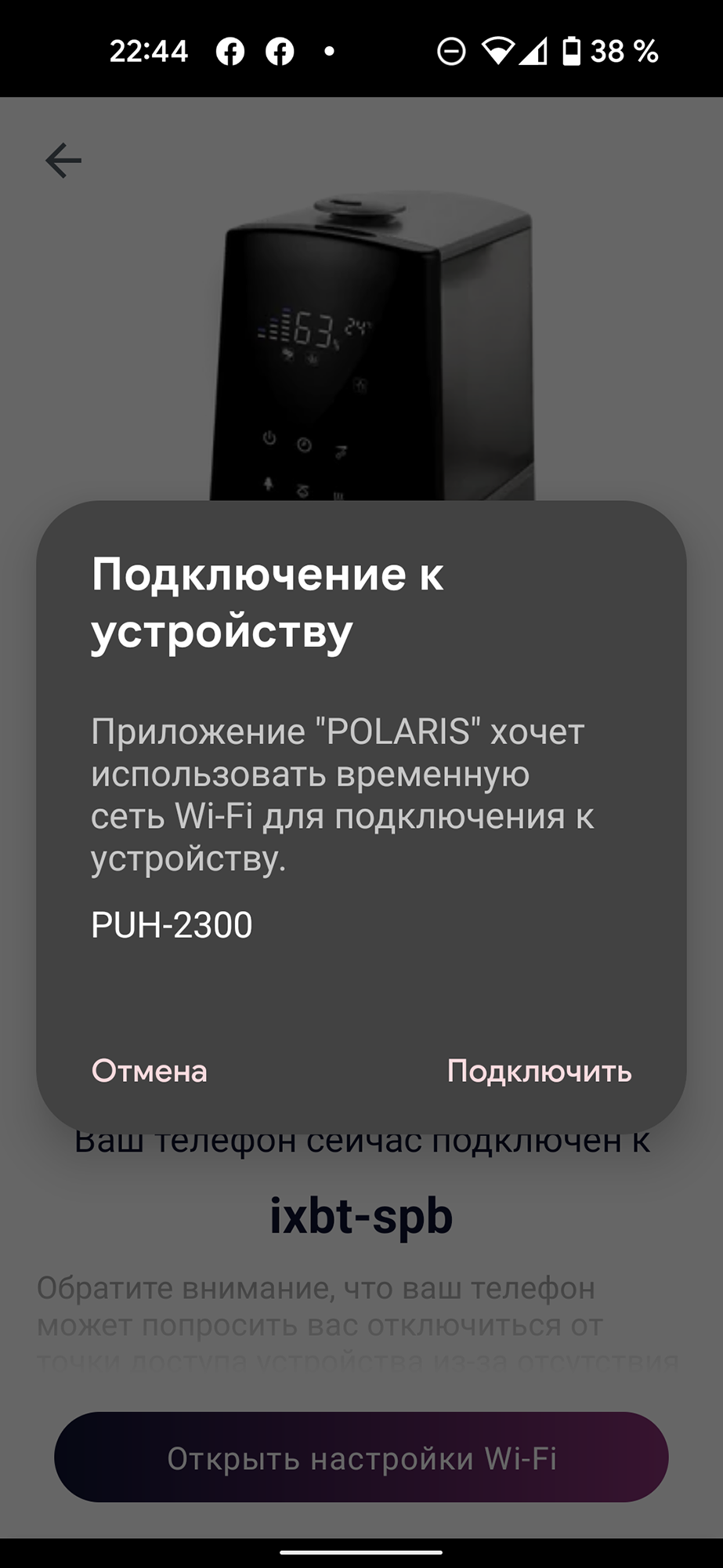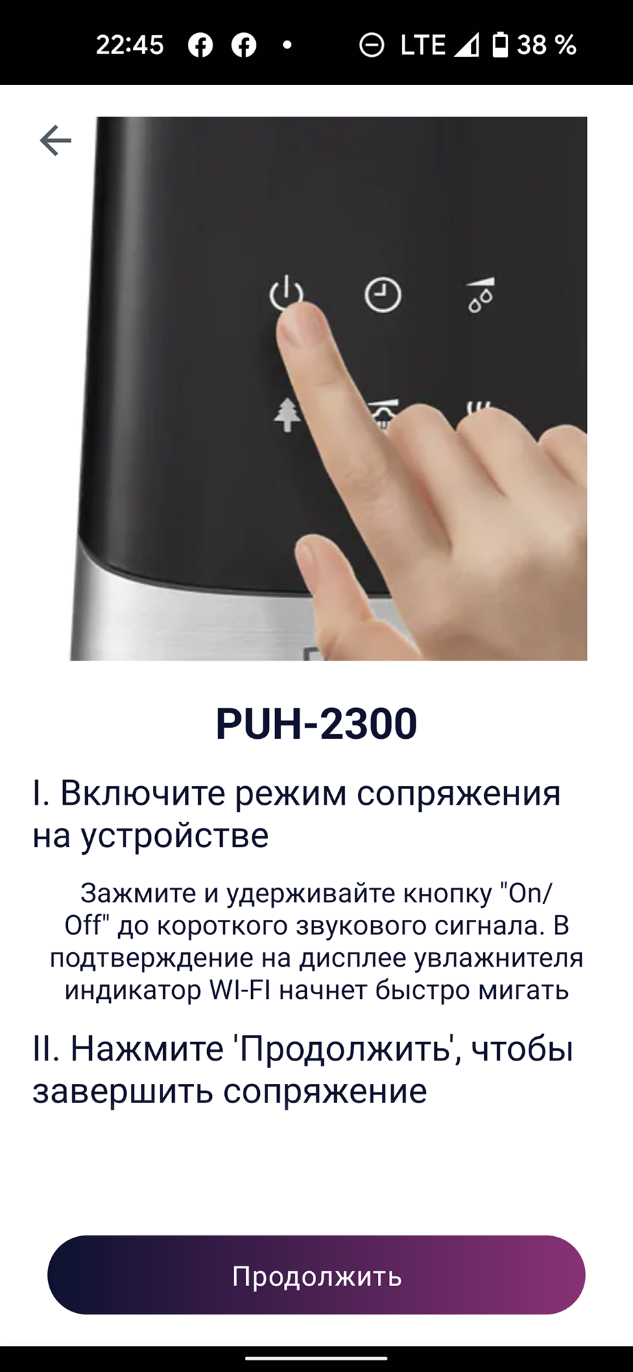Приложение запрашивает SSID и пароль Wi-Fi-cети, объясняет нам, как активировать на устройстве функцию сопряжения (для этого используется длинное нажатие на кнопку включения), после чего подключается к увлажнителю через созданную временную сетку и передает ему новые настройки.