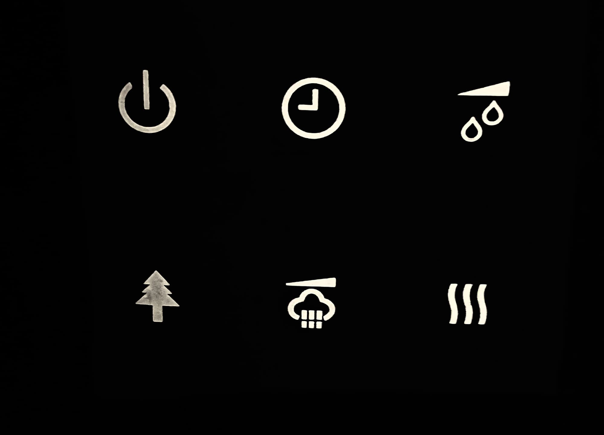 Для ручного управления увлажнителем предназначены шесть сенсоров на передней панели. В верхнем ряду располагаются кнопки: