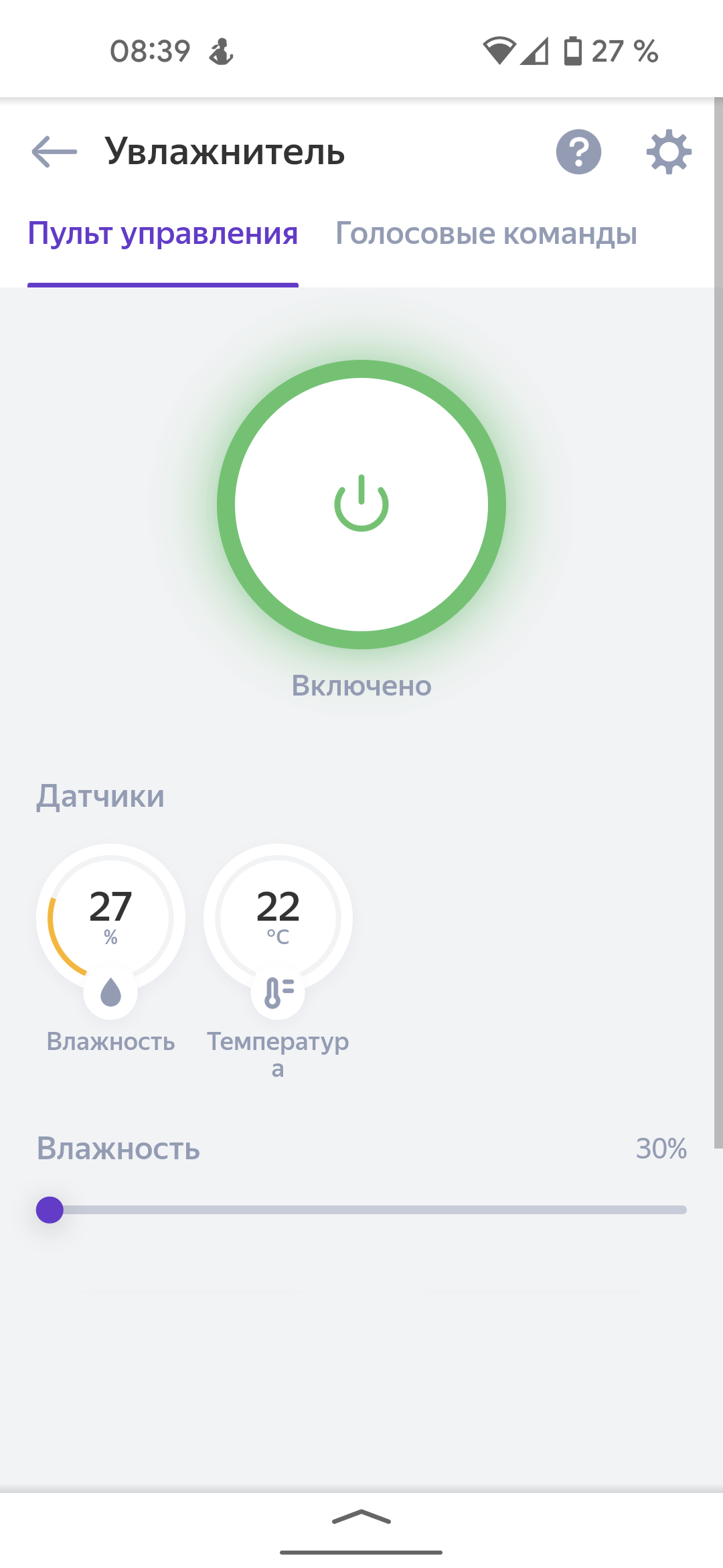 Подключенная к «Алисе» модель позволяет включить или выключить его вручную с помощью виртуальной кнопки, настроить целевую влажность, подсветку, интенсивность увлажнения — словом, здесь доступны все функции приложения.