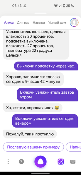 Протестировали мы и заявленную совместимость увлажнителя с голосовым помощником Яндекса.