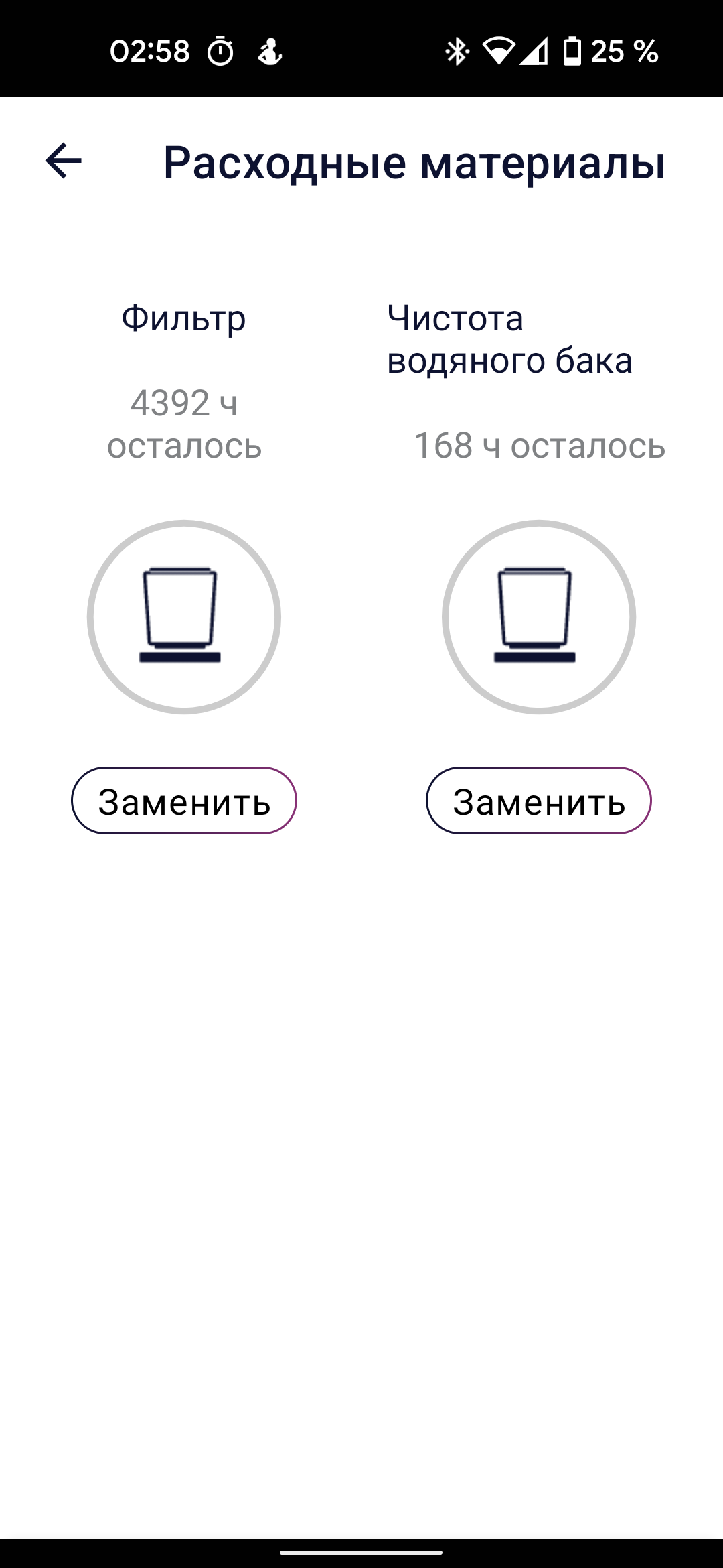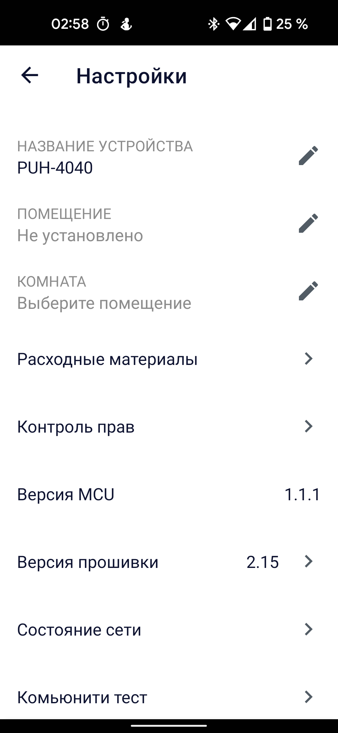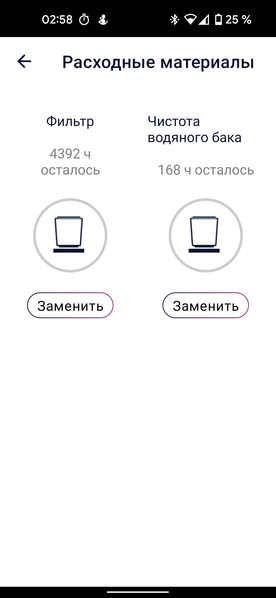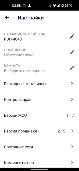 На странице настроек мы можем переименовать прибор или помещение, к которому оно привязано; проверить ресурс расходных материалов (в нашем случае — смягчающего фильтра и времени до следующей очистки водяного бака); добавить или удалить пользователя, у которого есть доступ к увлажнителю, и прочитать электронную версию руководства по эксплуатации.