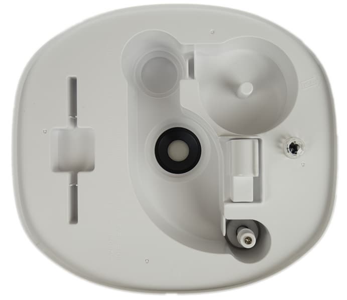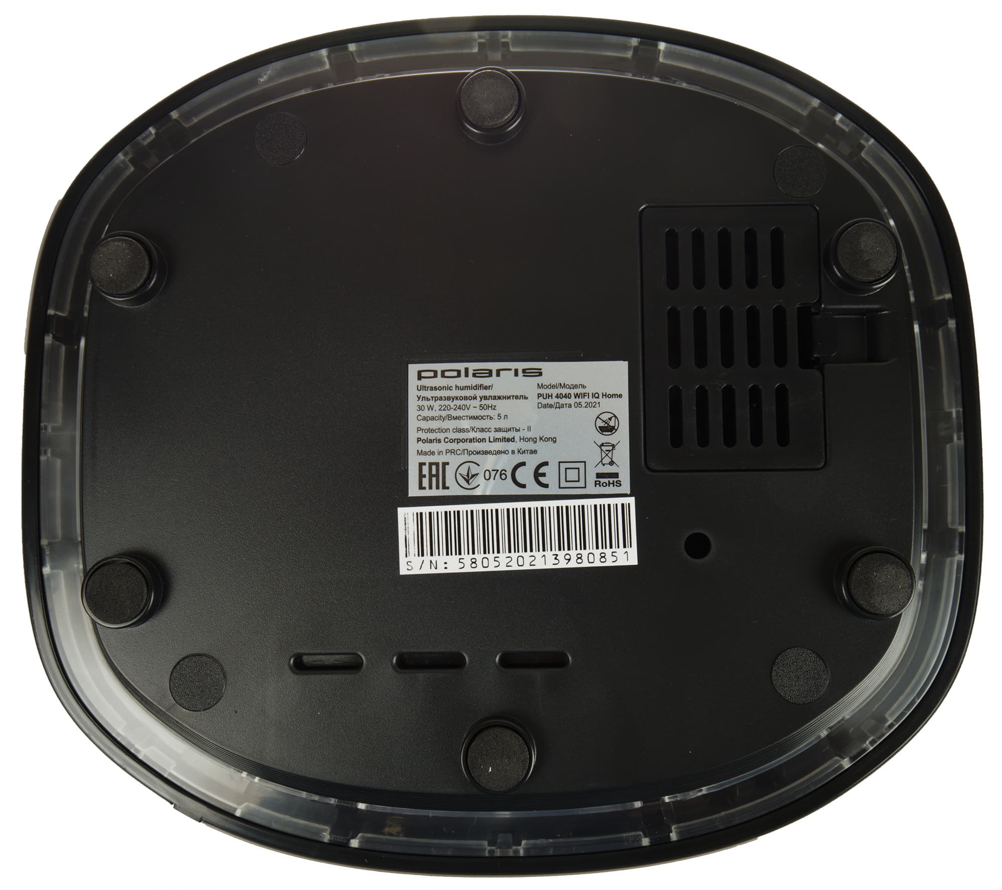Воздух поступает в увлажнитель через решетку в нижней части основания. Устойчивость прибору придают шесть круглых ножек с резиновыми противоскользящими накладками.