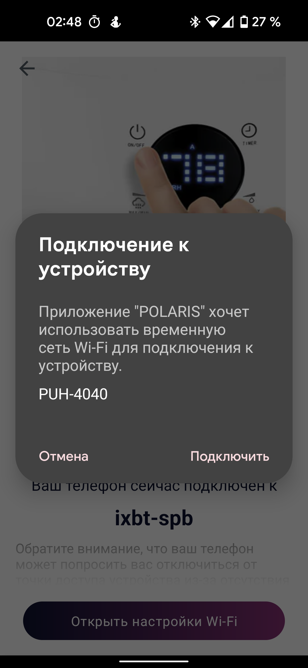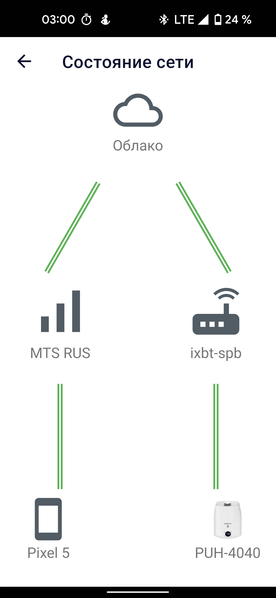 Приложение IQ Home позволяет управлять увлажнителем из любой точки земли — находиться в одной сети с прибором совершенно не обязательно. При возможных сбоях подключения можно проверить состояние сети: приложение наглядно покажет схему сетевого соединения с прибором и укажет на проблемные участки на длинном пути от нашего мобильника до установленного в домашней сети устройства.