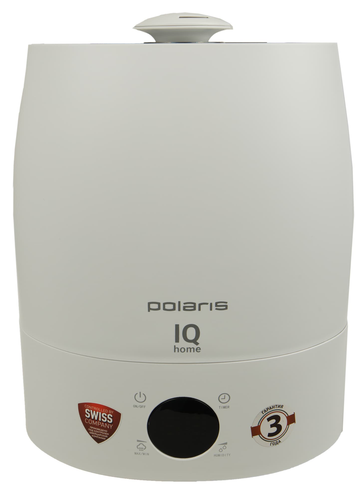 Корпус увлажнителя Polaris PUH 4040 выполнен из матового белого пластика и имеет форму чуть сужающейся вверх башенки. Прибор состоит из двух основных частей: бака для воды, который установлен на основание с рабочей камерой. Спереди на основании находится панель управления со светодиодным дисплеем и четырьмя кнопками. Здесь же производитель разместил две рекламные наклейки: одна из них информирует, что устройство произведено под контролем швейцарской компании, вторая напоминает о длительном (3 года) сроке гарантии.