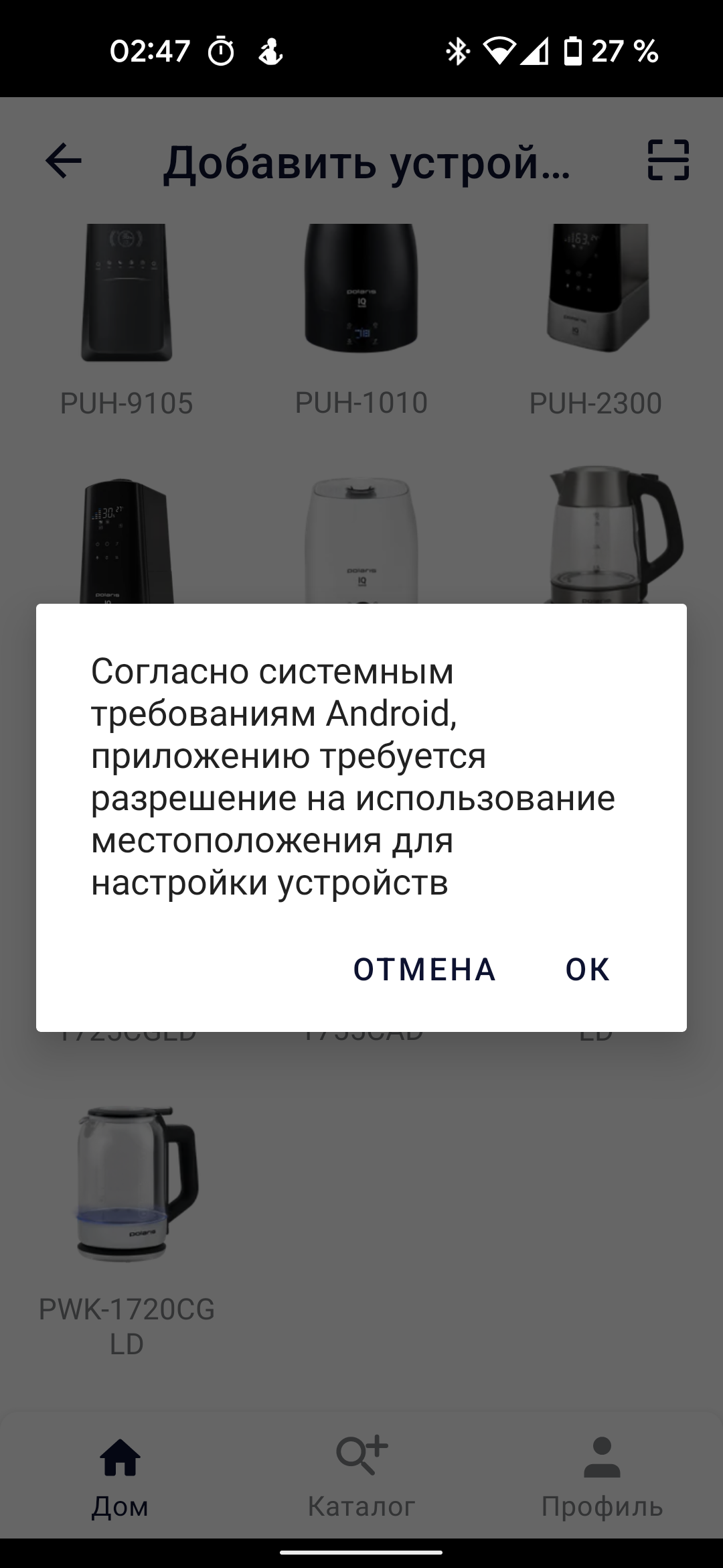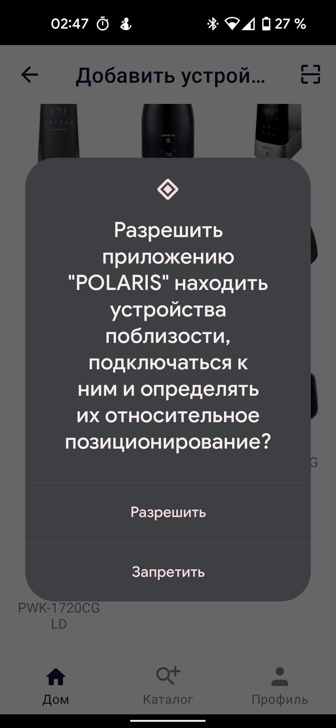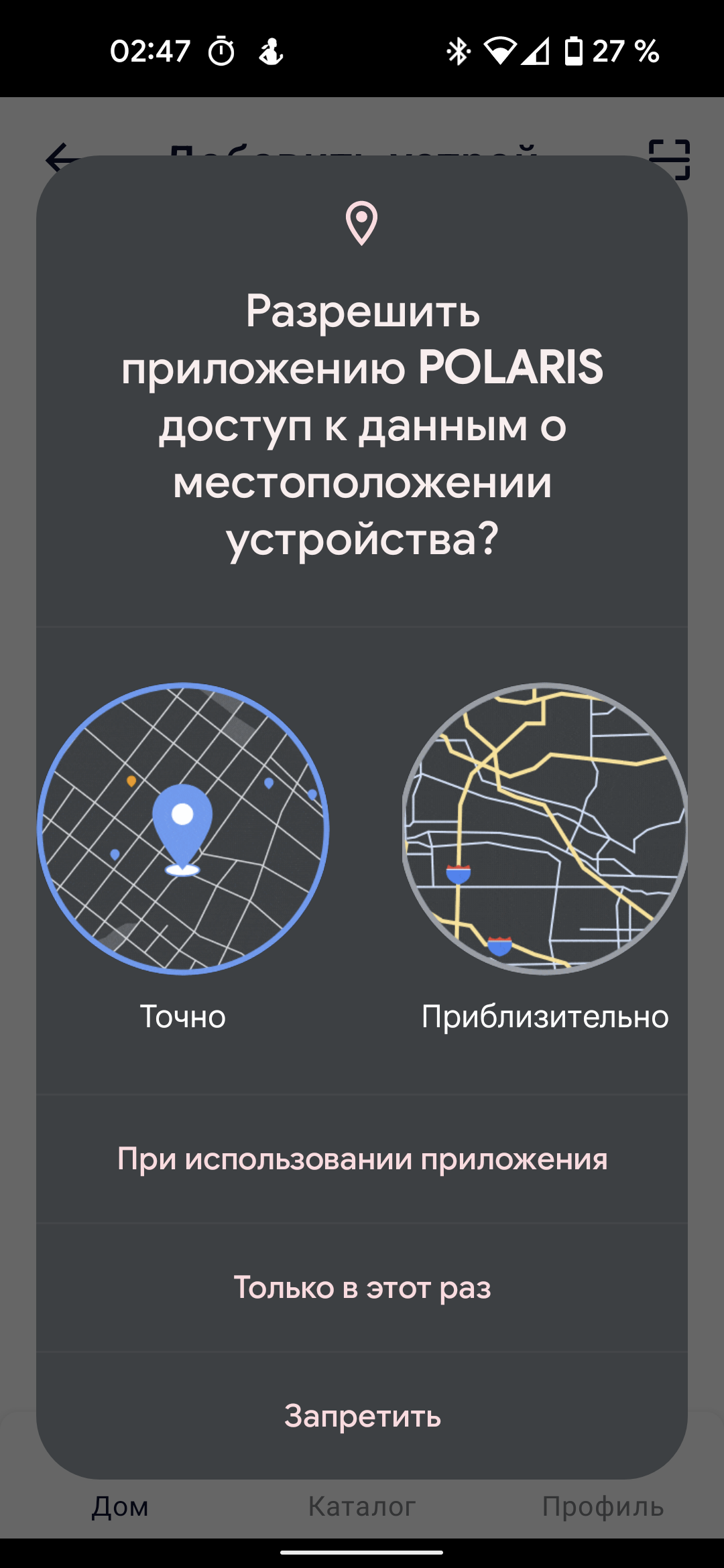 Приложение запрашивает доступ к местоположению и разрешение находить приборы поблизости.
