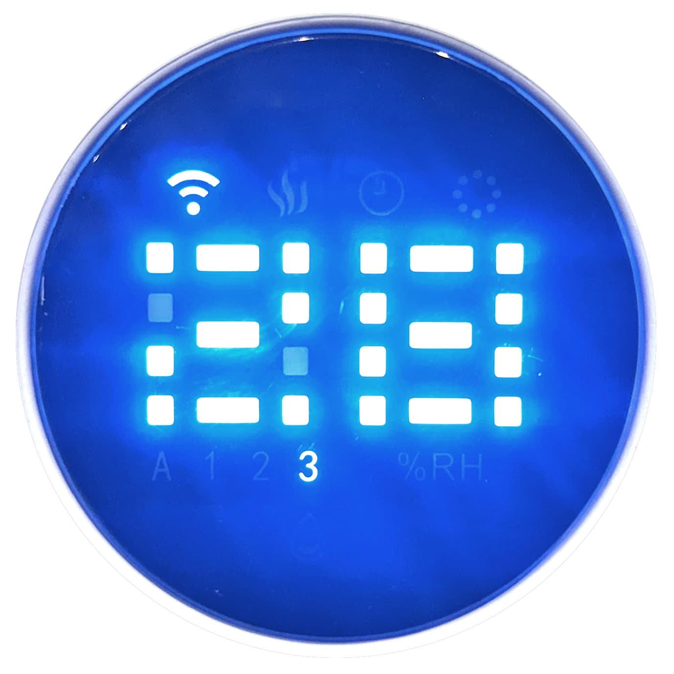 Кнопка Humidity позволяет задать целевой уровень влажности, при достижении которого увлажнитель приостановит работу. Он устанавливается в диапазоне от 25% до 75% с шагом в 5%. При работе в этом режиме на дисплее отображается значок «%RH»; узнать, что мы там задали, можно, коротко нажав на кнопку Humidity. Длинное нажатие на сенсор включает ночной режим: подсветка дисплея гаснет.