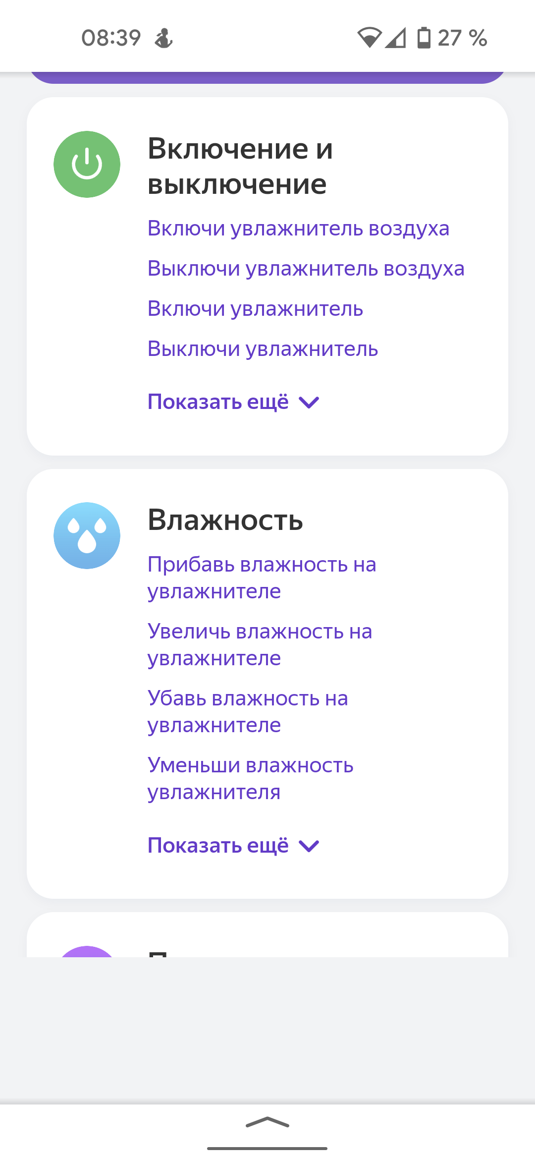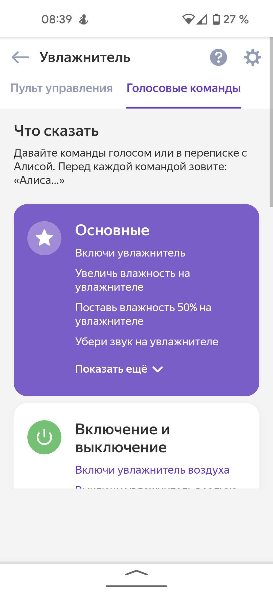Приложение предоставляет широкий спектр голосовых команд. С помощью голосовой помощницы от Яндекса можно узнать текущее состояние устройства, проверить параметры микроклимата в помещении, включить или выключить увлажнитель и настроить его мощность. Примеры команд доступны в соответствующем разделе.