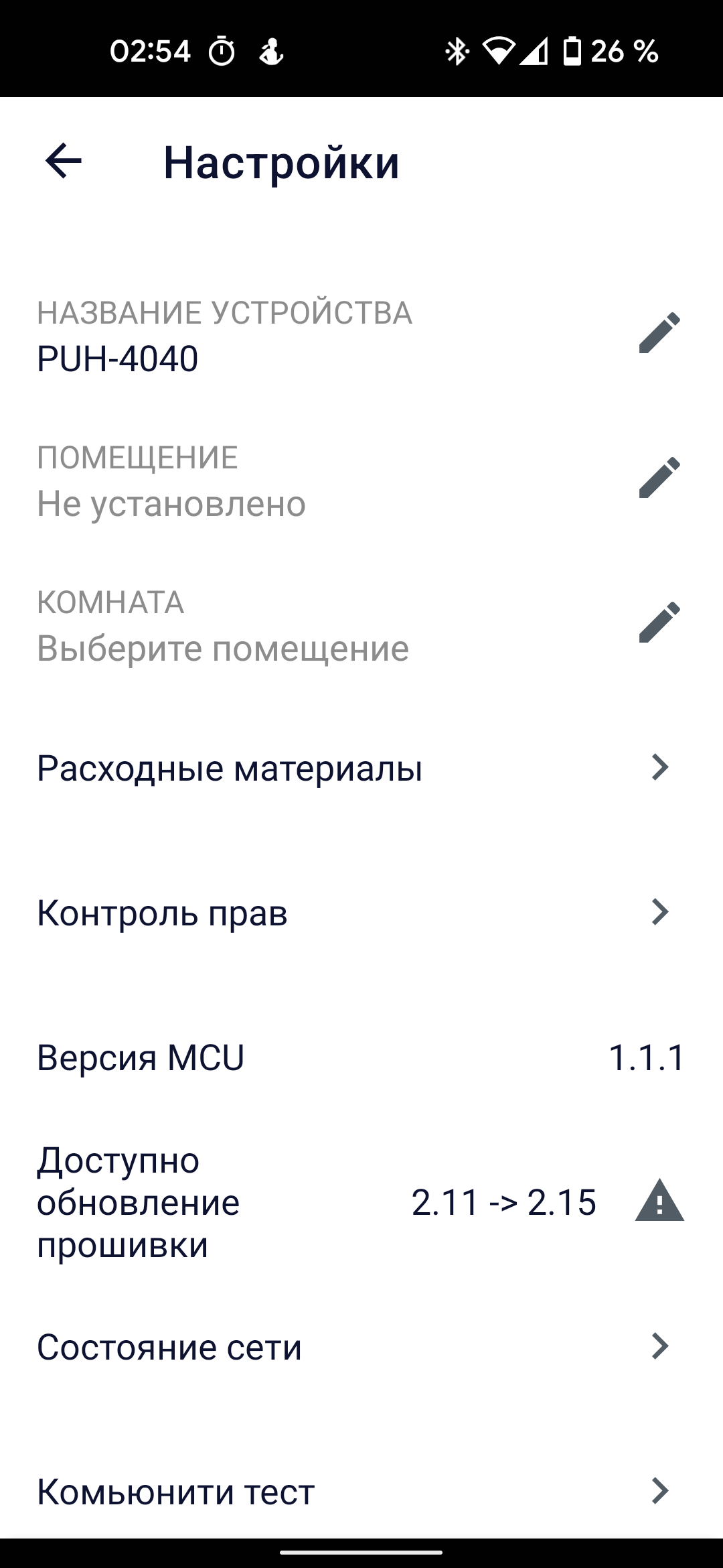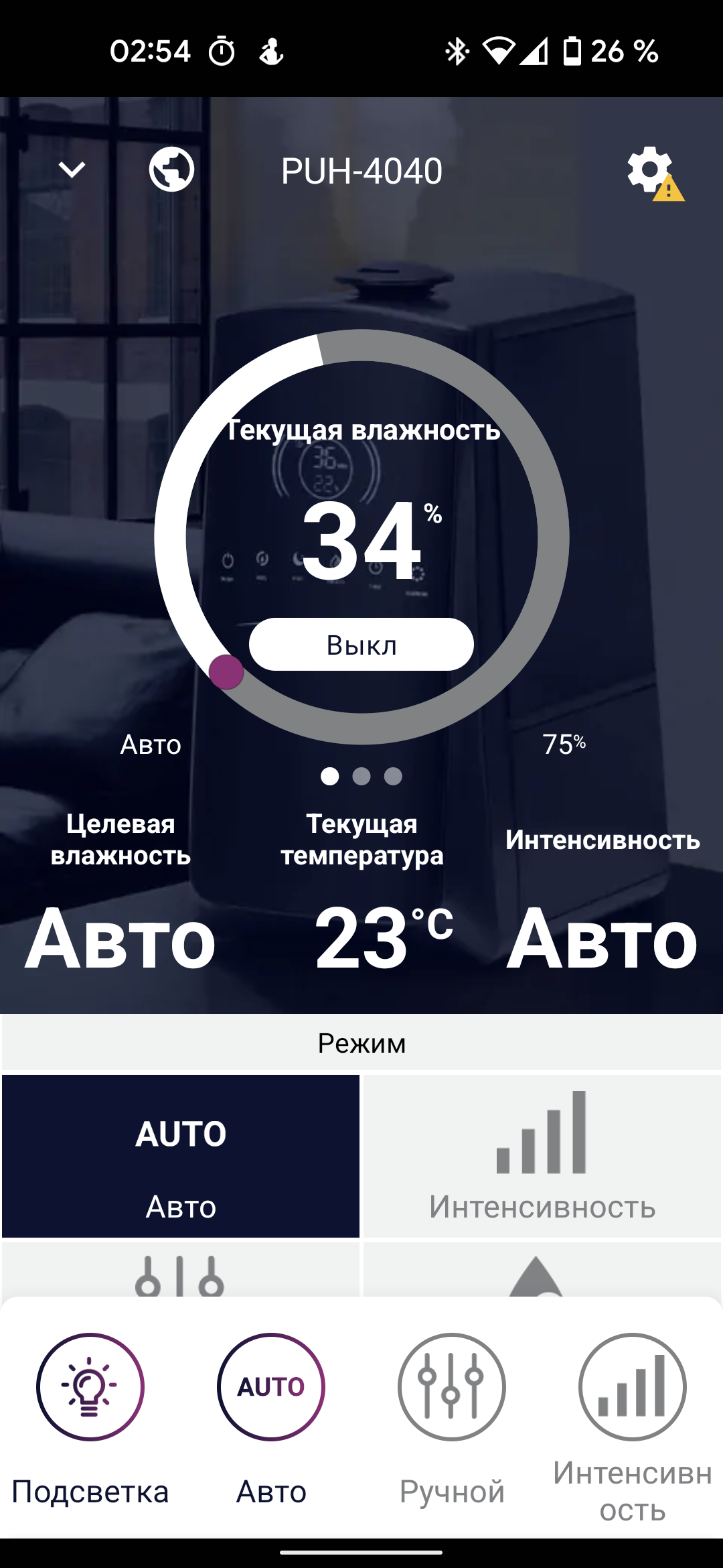 На этом этапе важно обратить внимание на восклицательный знак, всплывающий над кнопкой настроек в правом верхнем углу экрана: для нашего увлажнителя доступно обновление прошивки, которое настоятельно рекомендуется установить.