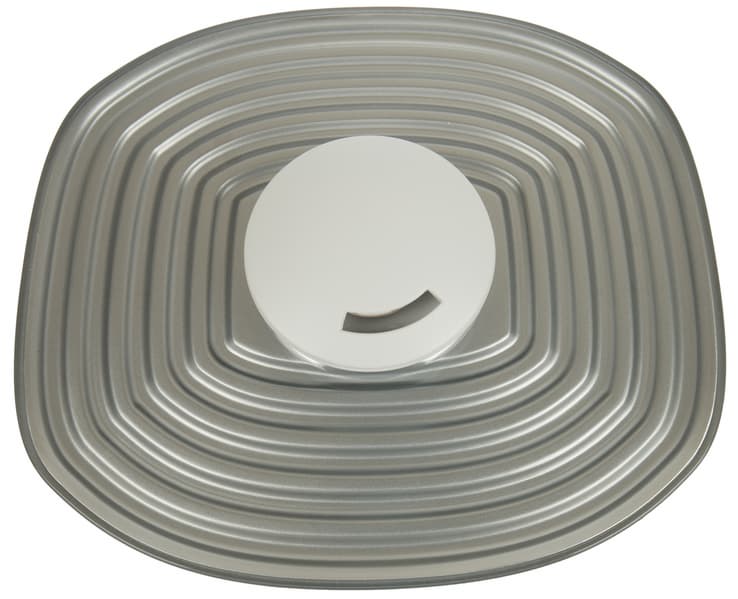 Крышка из серебристого пластика занимает всю верхнюю часть увлажнителя. Она выглядит ребристой, но на ощупь оказывается гладкой: поверх рифленого материала, имитирующего металл, нанесен прозрачный гладкий слой: такое решение оживляет верх прибора, но не позволяет конденсату скапливаться в углублениях.