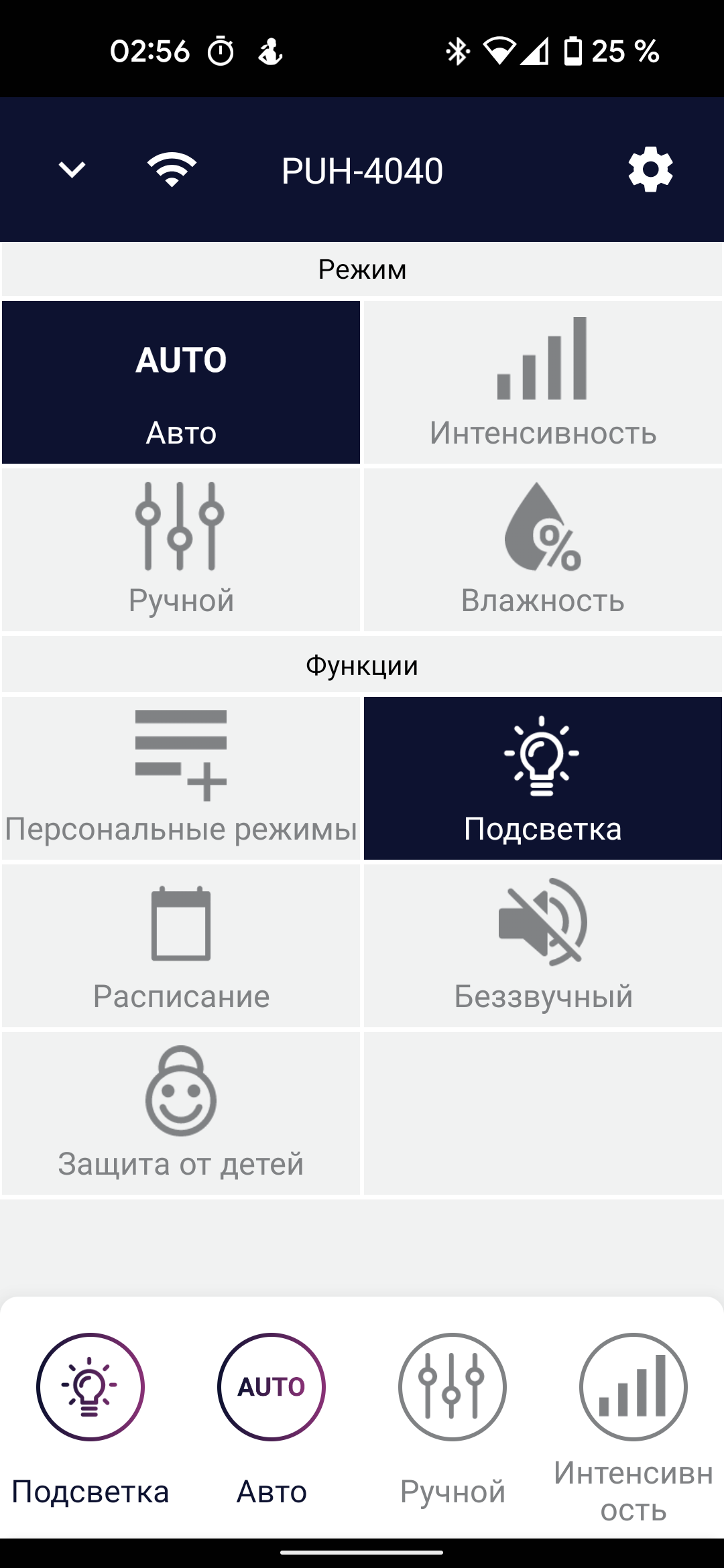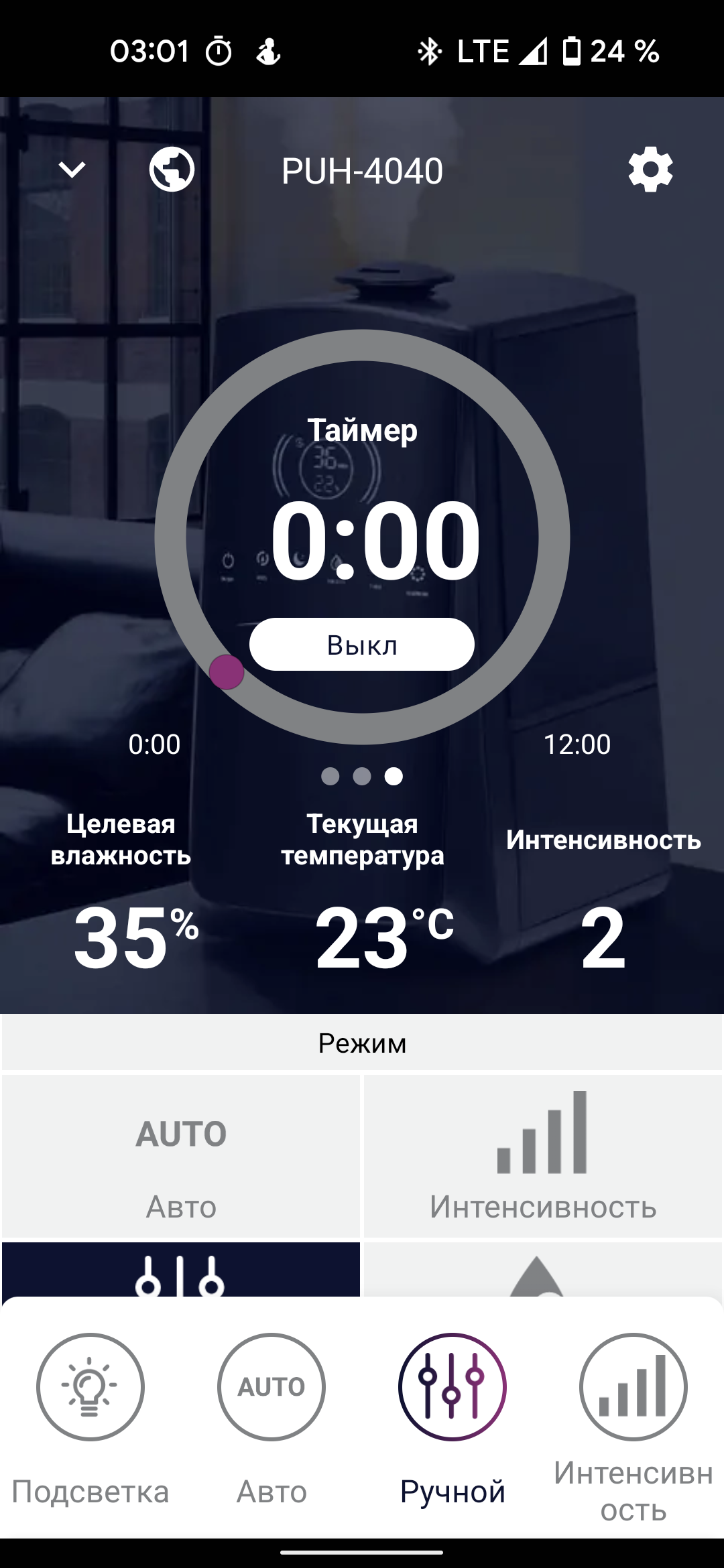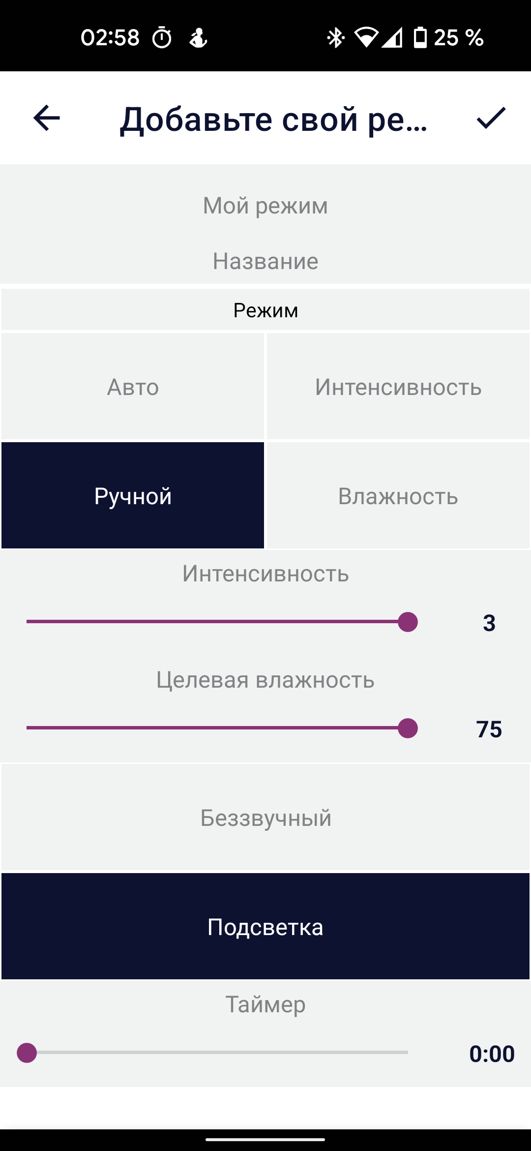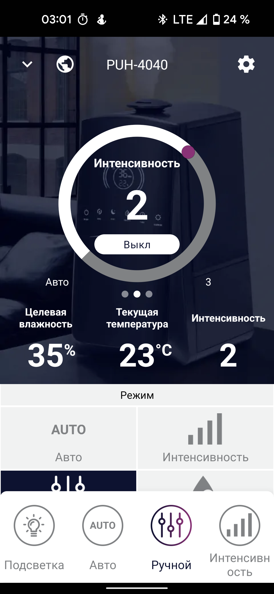 Чуть ниже можно выбрать подходящий режим работы (автоматический, ночной, детский, ручной) или настроить свой собственный, выбрав интенсивность увлажнения, целевую влажность.