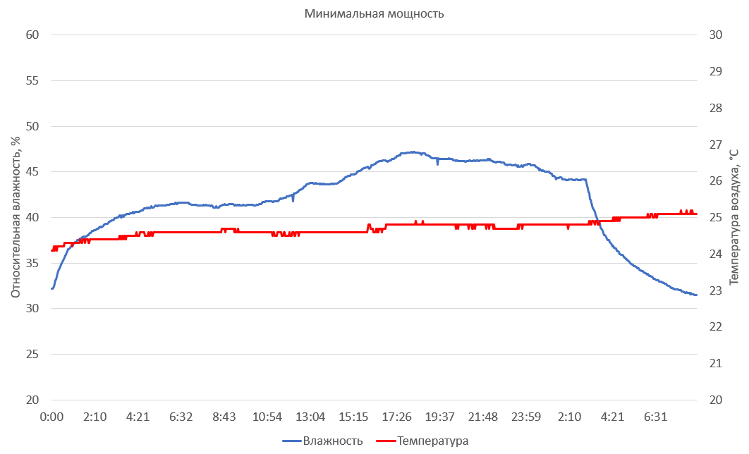 На минимальных «оборотах» наш увлажнитель улучшал климат в комнате в течение приблизительно 26 часов. Максимальная относительная влажность, достигнутая при этом тесте, составила 47%. К моменту опустошения бака влажность в помещении чуть снизилась, оставаясь, тем не менее, на вполне комфортном уровне.