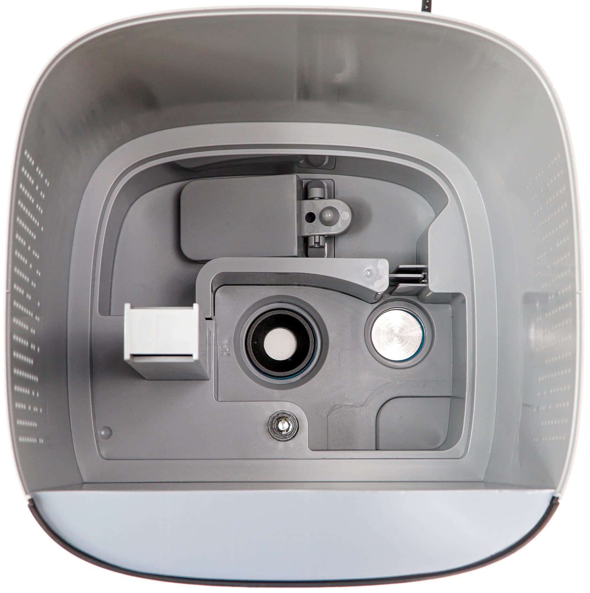 Под бачком расположена рабочая емкость увлажнителя, внутри которой мы опознали мембрану ультразвукового излучателя, воздухозаборник, поплавок, сигнализирующий о низком уровне воды в устройстве, круглую металлическую панель нагревателя для функции «теплый пар» и светодиодную лампу подсветки синего цвета.