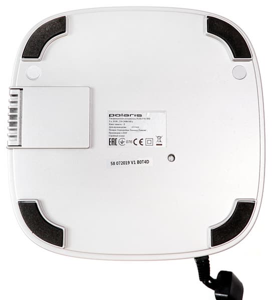 На дне прибора размещены четыре полукруглых ножки с прорезиненными накладками, обеспечивающими хорошее сцепление с любой гладкой поверхностью, а также шильда с названием производителя, модели, техническими характеристиками, информацией о стране-производителе, гарантийном сроке и серийным номером.