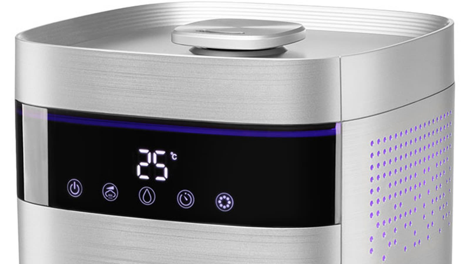 Длительное нажатие на эту кнопку активизирует ночной режим: у прибора отключаются синяя подсветка вентиляционных отверстий, дисплей и подсветка панели управления, за исключением кнопки включения, которая начинает плавно мигать. Для выхода из ночного режима достаточно однократно нажать на любую кнопку — удобнее всего нажимать на кнопку включения.