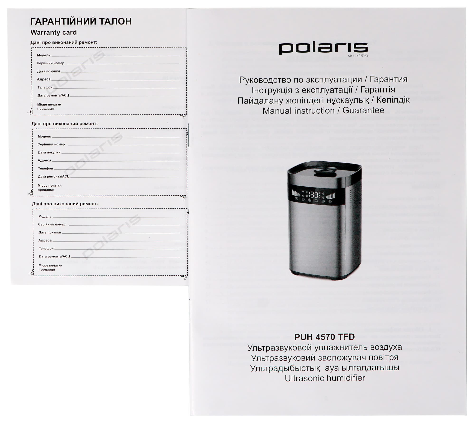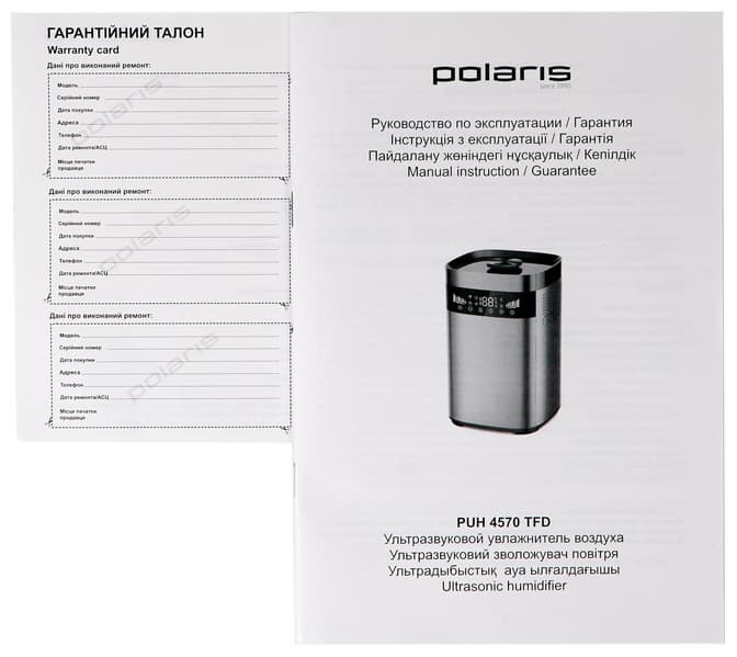 Брошюра формата А5 на белой глянцевой бумаге совмещает руководство по эксплуатации увлажнителя и гарантийную книжку. Ее отличительная особенность — очень мелкий шрифт, который будет не слишком удобно читать людям с плохим зрением.