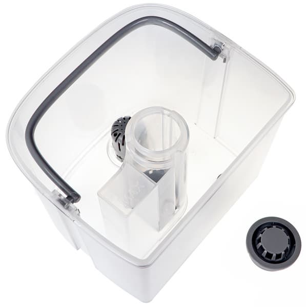 Когда мы открыли крышку, то обнаружили внутри съемный бачок для воды из полупрозрачного пластика светлого цвета. У него есть пластиковая ручка для удобства извлечения и переноски. Через центральную часть бачка проходит тоннель для выхода пара с выступом для воздухозаборника — верхняя грань этого выступа является одновременно отметкой максимального уровня воды. На дне бачка размещается клапан подачи воды в рабочую емкость устройства, совмещенный со съемным фильтром, наполненным керамическими шариками.