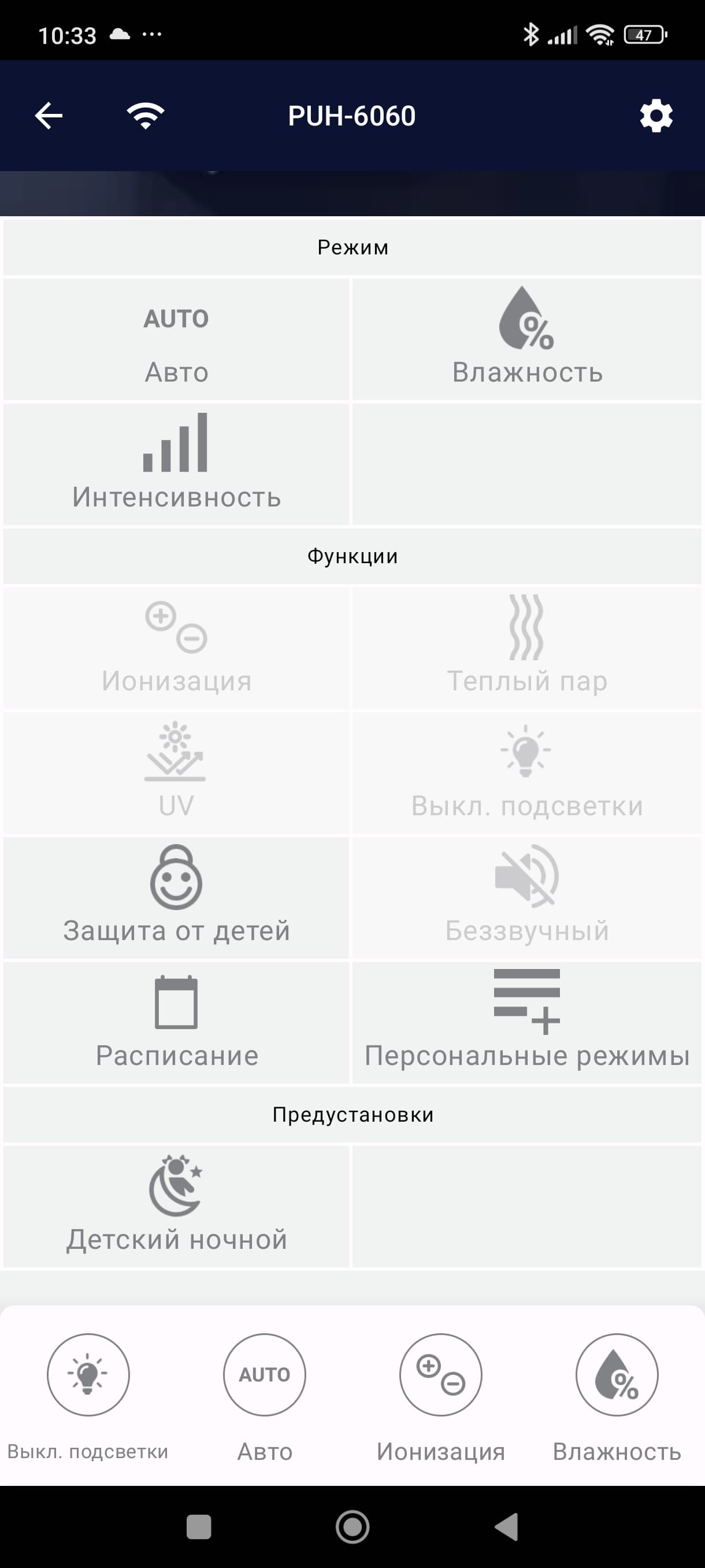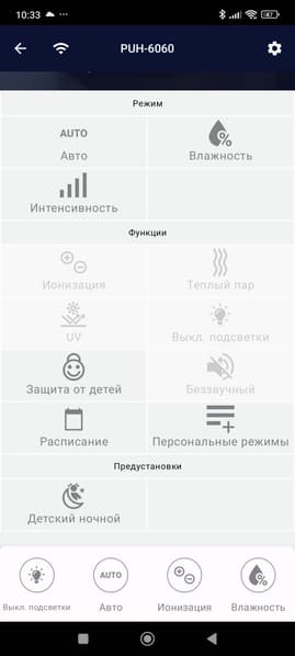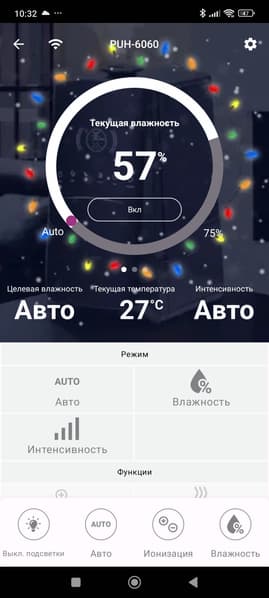 Тут можно изменить целевую влажность, выбрать «скорость работы» (т. е. интенсивность увлажнения), заблокировать панель управления прибора, а также включить либо отключить ионизацию.