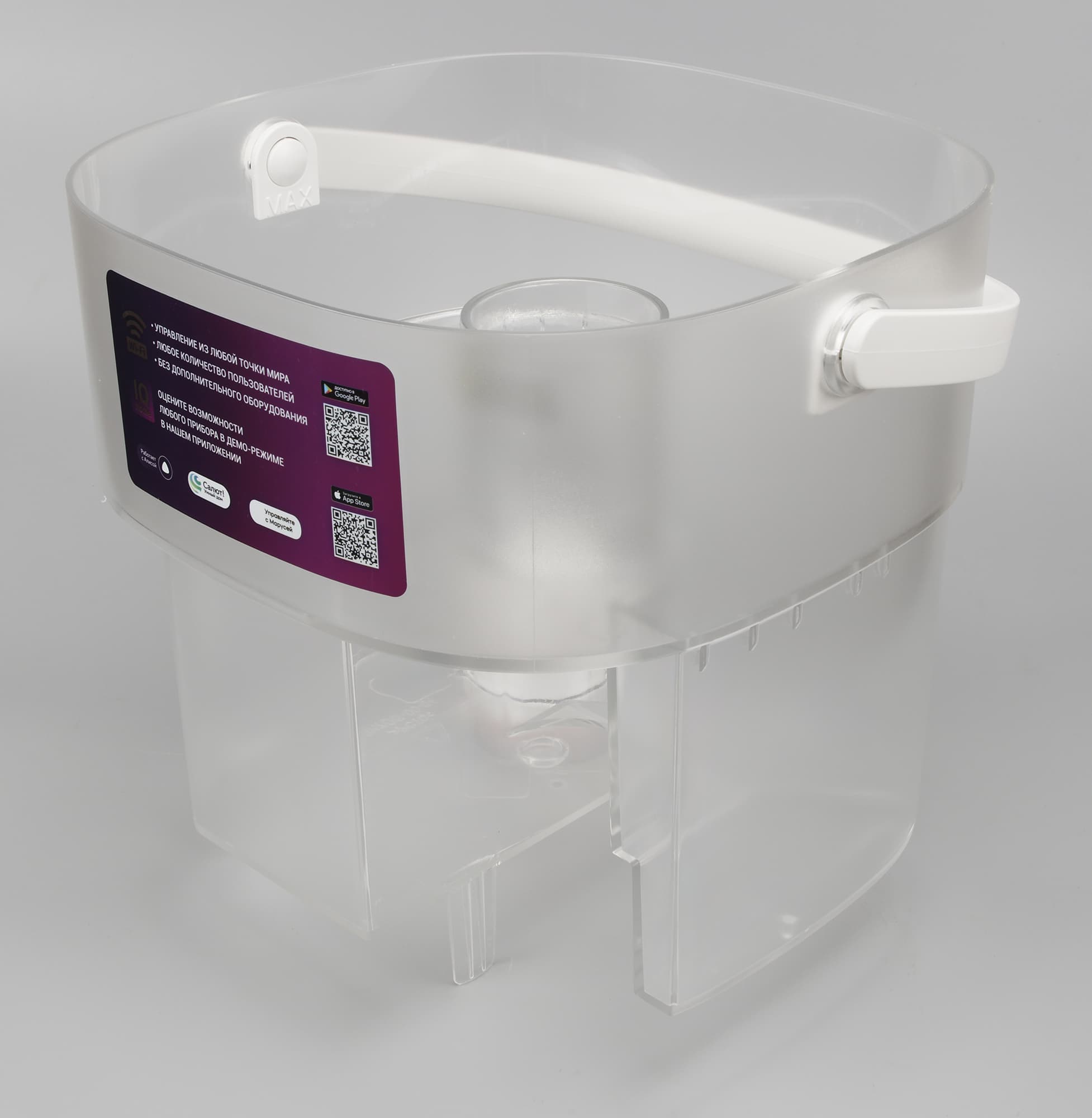 У бака имеется пластиковая ручка для удобства извлечения и переноски. На креплении ручки находится отметка Max, намекающая, что воду нужно заливать не выше уровня крепления.