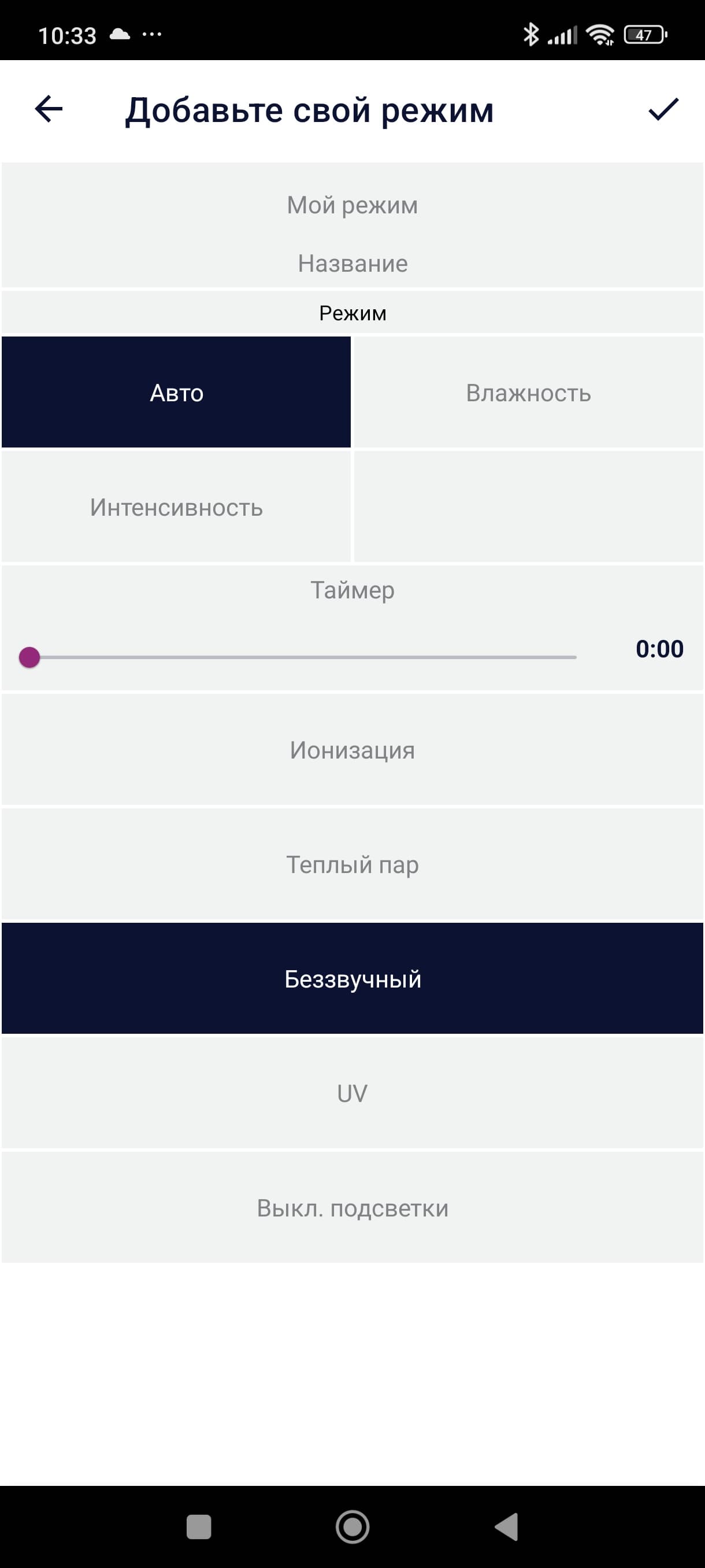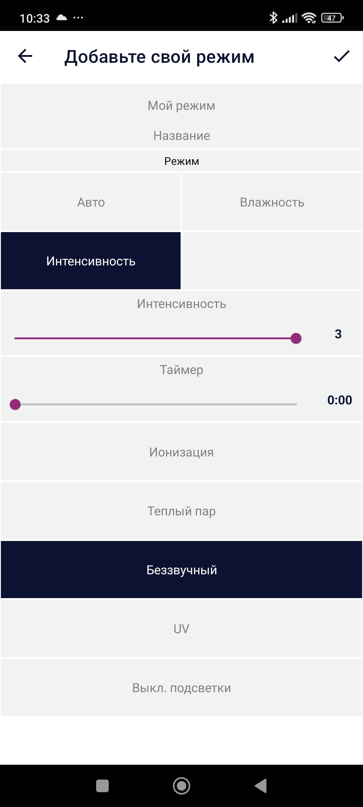 Под кругом находится информация о выбранном режиме, а рядом — температура и выбранная интенсивность увлажнения.