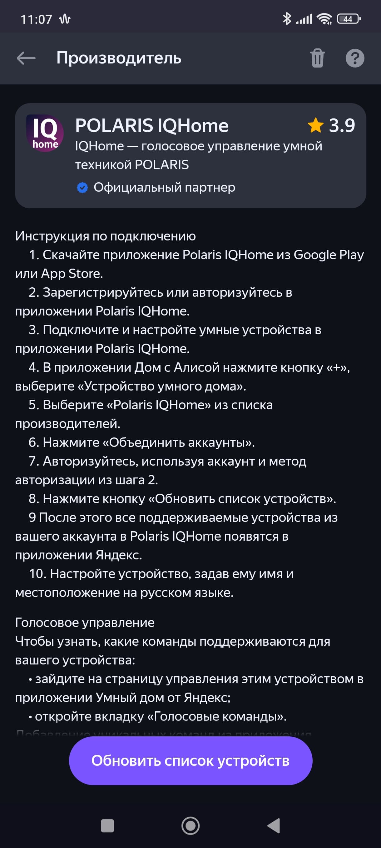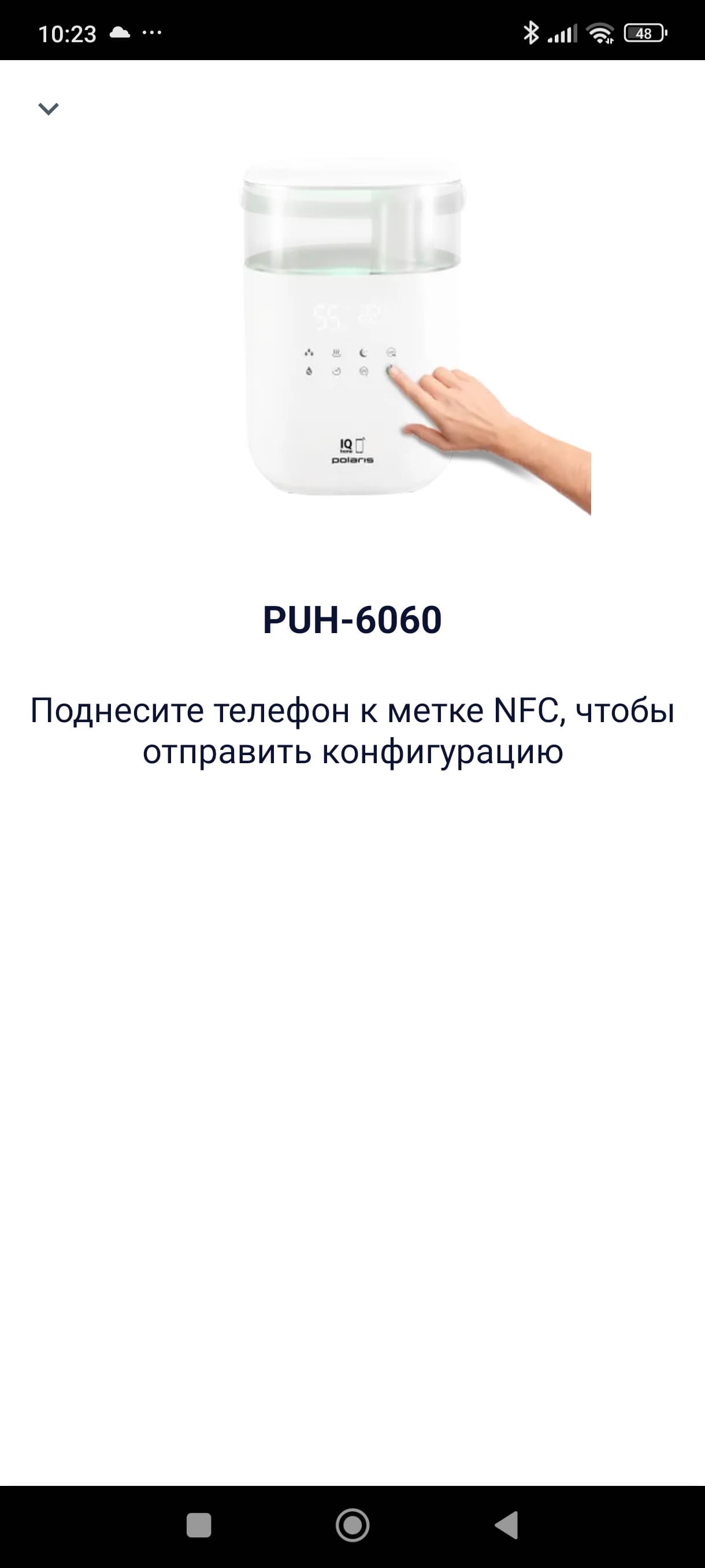 Инструкция приводит шаги по установке связи увлажнителя с приложением для Android и iOS. Следуя подсказкам, мы скачали приложение Polaris (IQ Home).