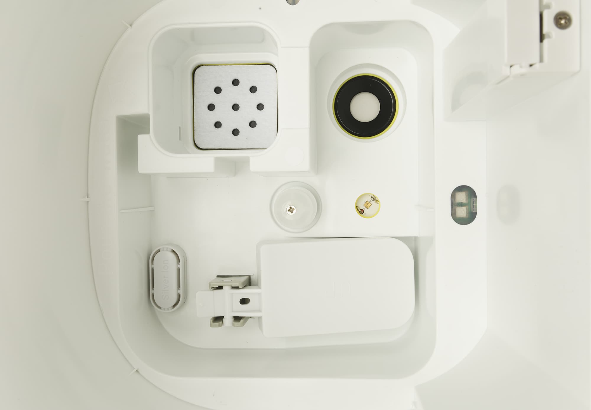 В левом верхнем углу мы видим прямоугольную металлическую панель нагревателя для функции «теплый пар». Она закрыта пористой накладкой. и ультрафиолетовая лампа.